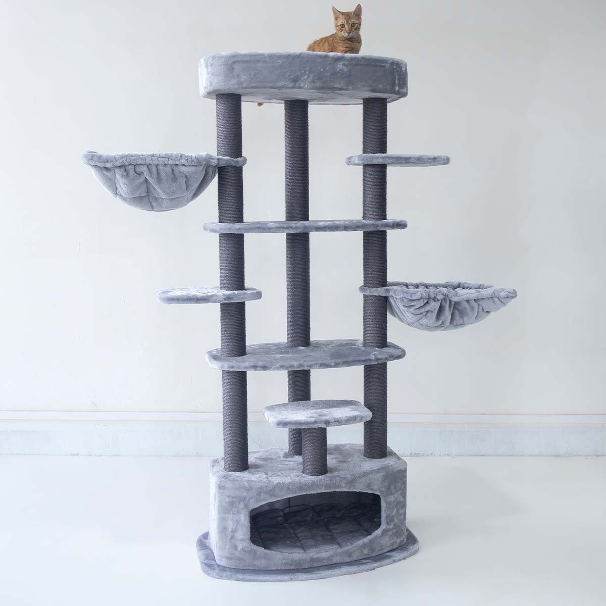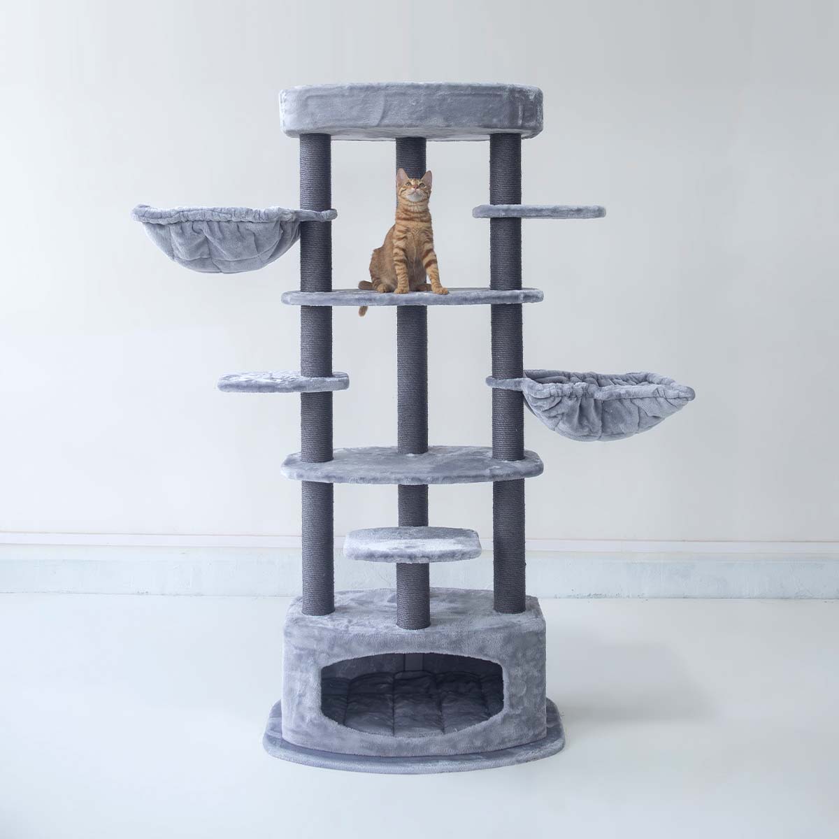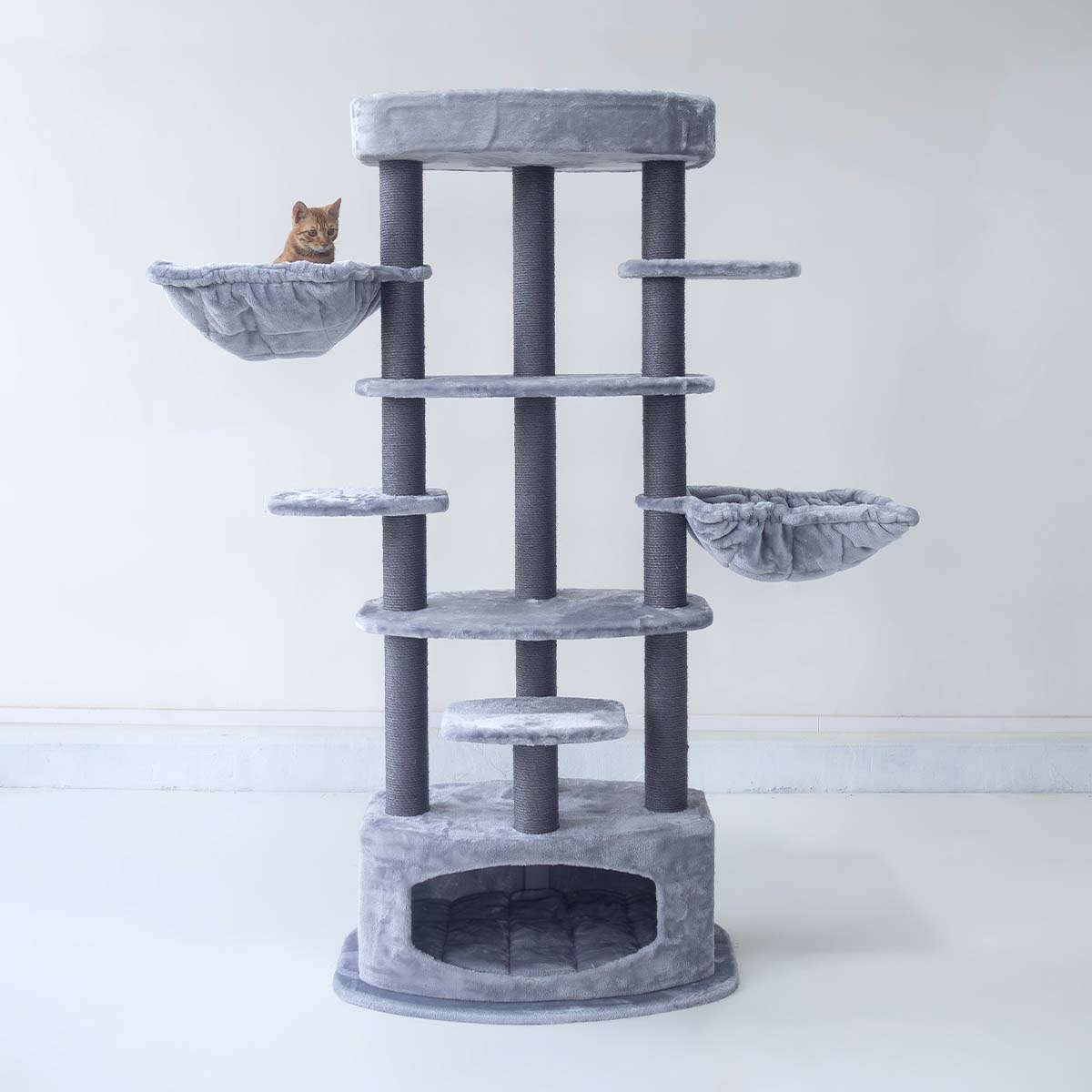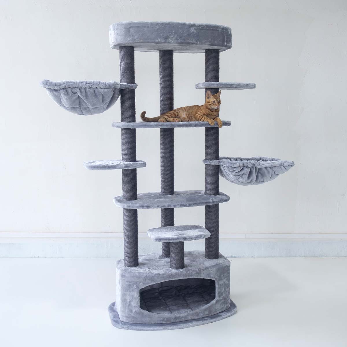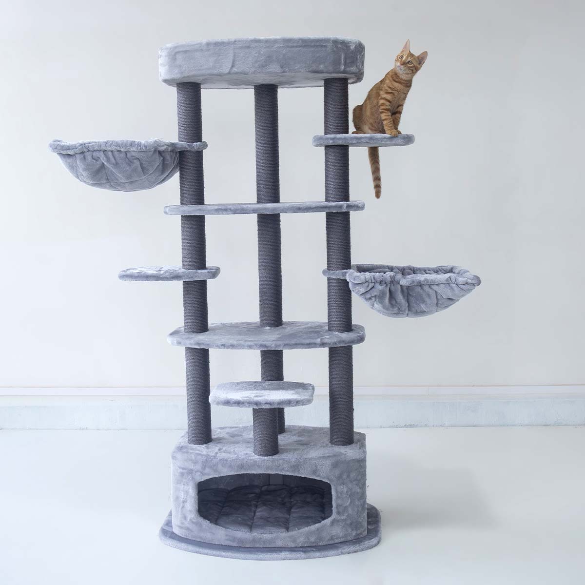 Unser Kratzbaum Alexandra 177 ist für Katzen gemacht, die gerne klettern, kratzen und springen. Denn all das geht auf diesem coolen Kratzbaum – die hohen Sisalstämme laden zum Kratzen ein und die Plattformen zum Klettern und Springen. Dieses hochgewachsene Kratzmöbel ist dank des Plüsches weich und kuschelig und ist mit einer stabilen und dicken Bodenplatte ausgestattet. Ganz oben gibt’s einen gemütlichen Loungekorb für Katzen, die alles im Blick behalten wollen, und das Schlafhäuschen unten ist ideal für Katzen, die sich gerne zurückziehen.