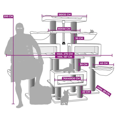 Leben bei dir mehrere Katzen? Oder hast du eine aktive Katze, der du ein richtiges Austob-Paradies bieten möchtest? Dann ist unsere Alley 200 die perfekte Wahl. Dieser Kratzbaum hat jede Menge Platz. Er ist nicht nur hoch, sondern auch sehr breit. Und mit nicht weniger als vier Hängematten, drei XXL-Schlafhäusern und einem extragroßen Lounge-Korb als Abschluss, gibt es viel Platz für alle und alles. Und du musst dir auch keine Sorgen um die Stabiltät machen. Denn durch die extra schweren Bodenplatten und die robusten Materialien, ist dieser Kratzbaum extrem stabil und langlebig.