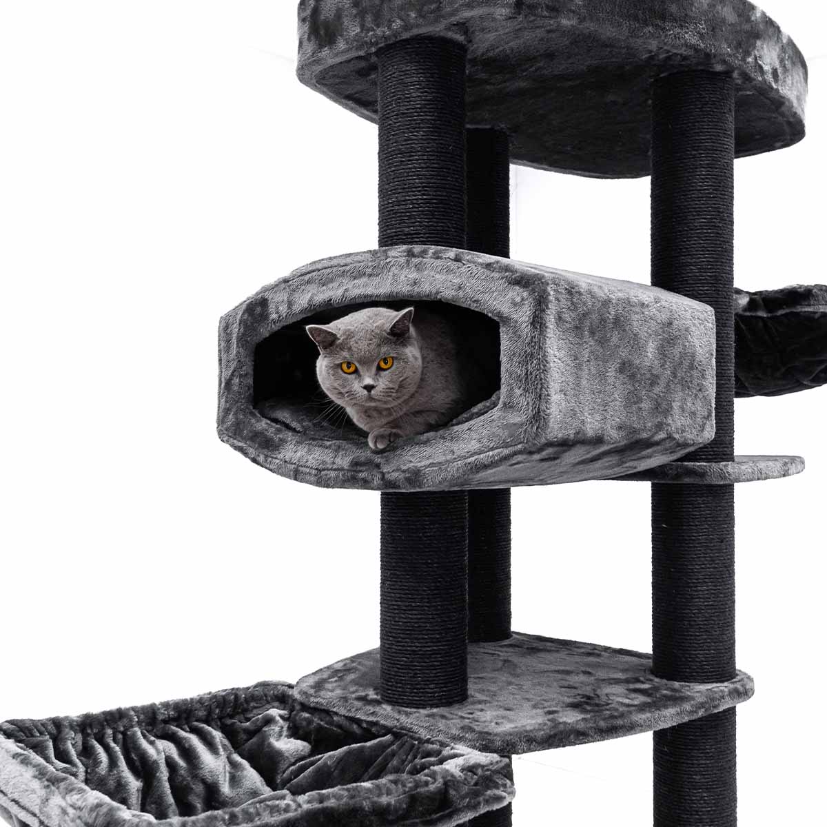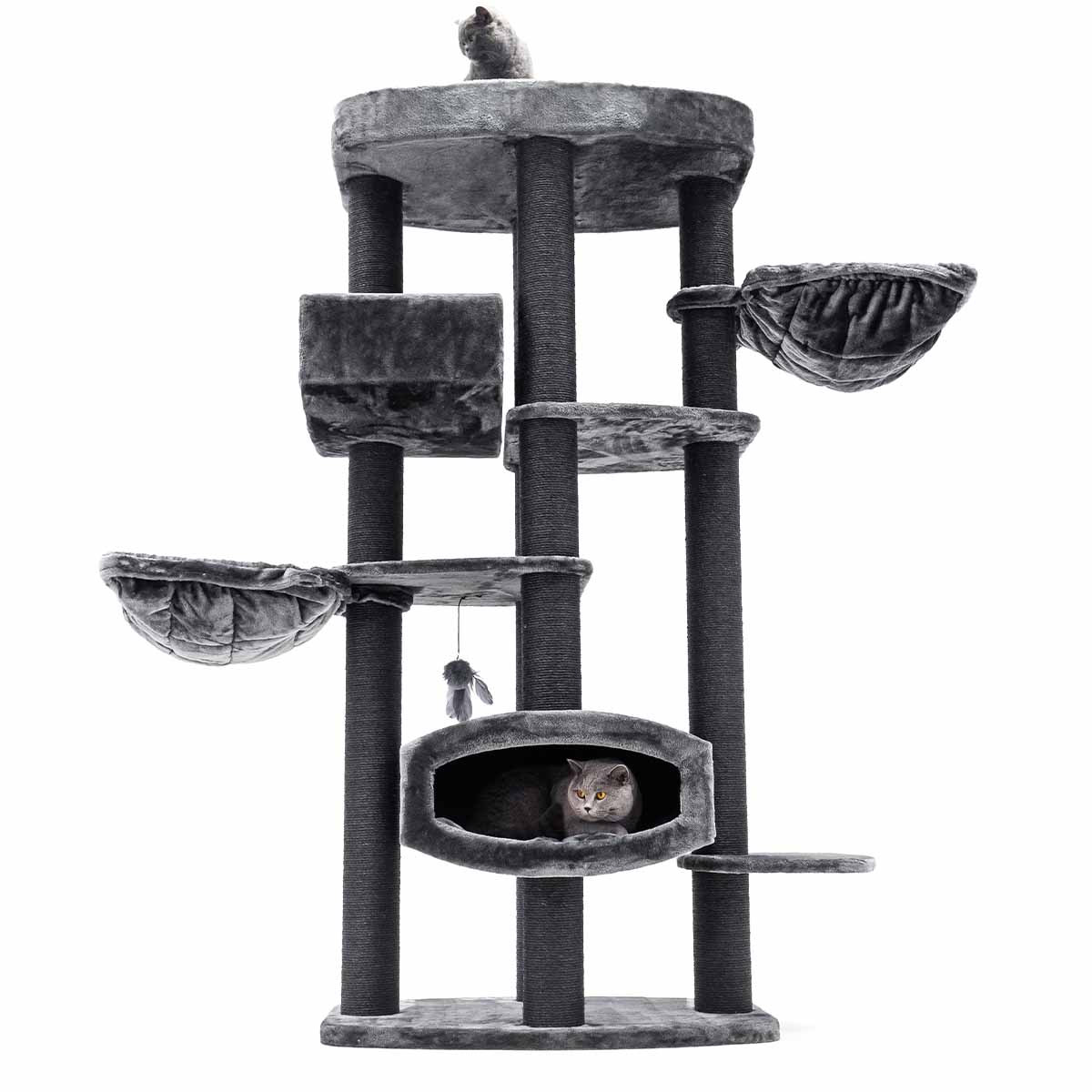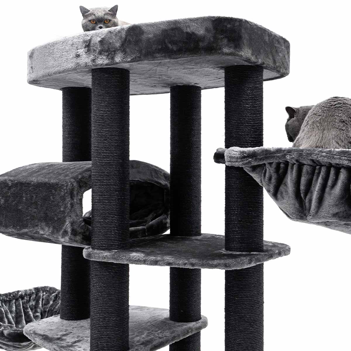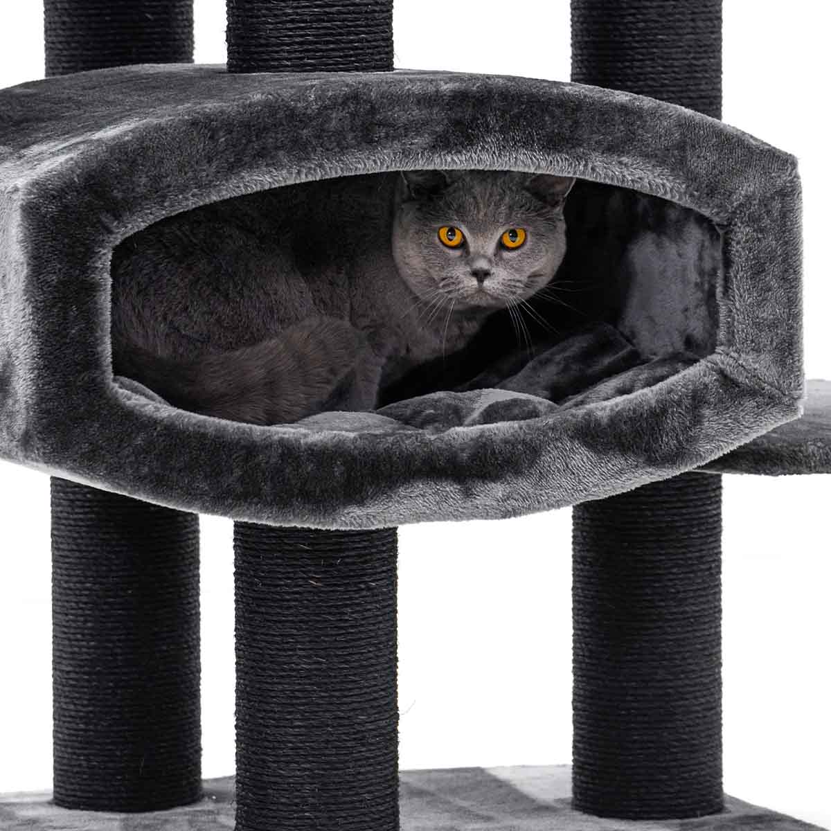 Auch Ruhe und Geborgenheit kommen bei diesem Kratzbaum nicht zu kurz, denn er hat viele weiche und sichere Schlafplätze – alle mit dickstem und weichstem Plüsch bezogen. Und dazu sieht er auch noch gut aus, was will man mehr?!
