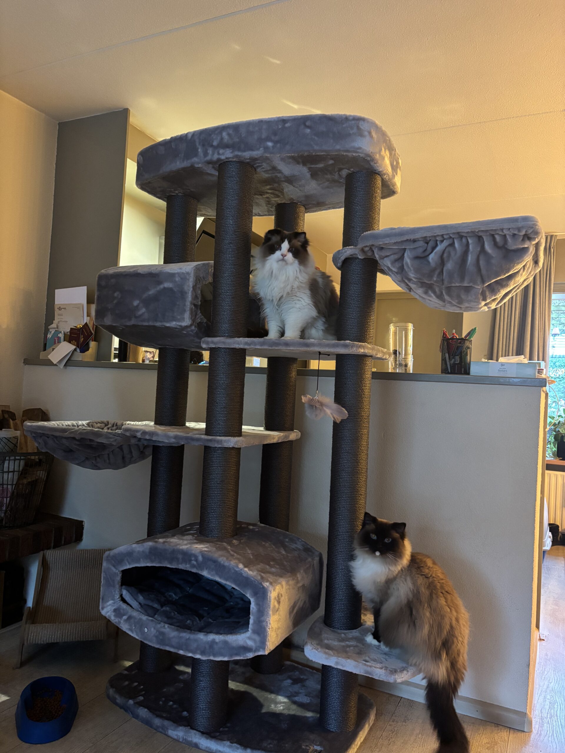 Geweldige, grote krabpaal. Veel plekken om te slapen/chillen, lange palen om in te klimmen, en zat plek om te spelen! Hij staat ook goed stevig wat wel fijn is met de rauwdouwers hier. Mijn meisjes zijn er héél blij mee.