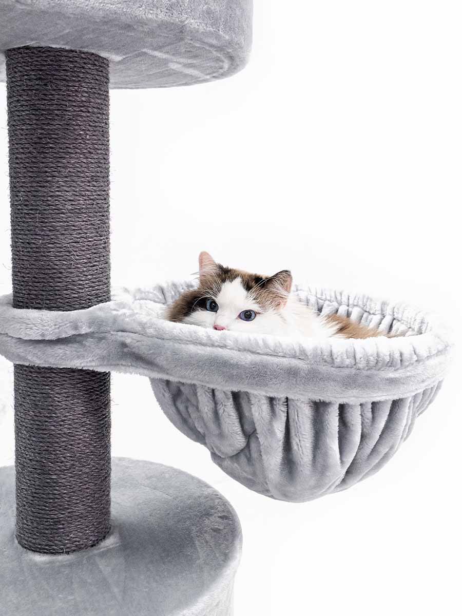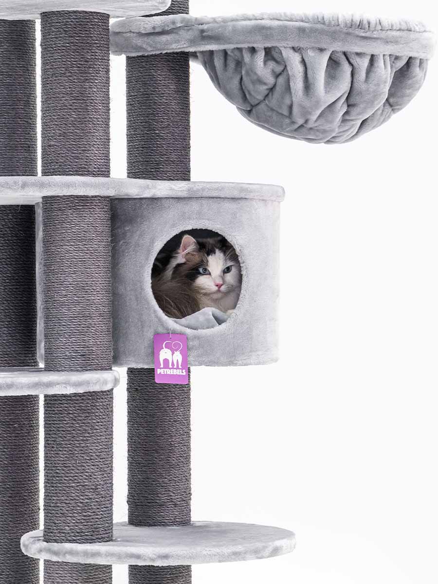 Mit Hängekorb, Katzenhaus und schön großem Loungekorb. Alle Ebenen sind clever durchdacht und leicht erreichbar