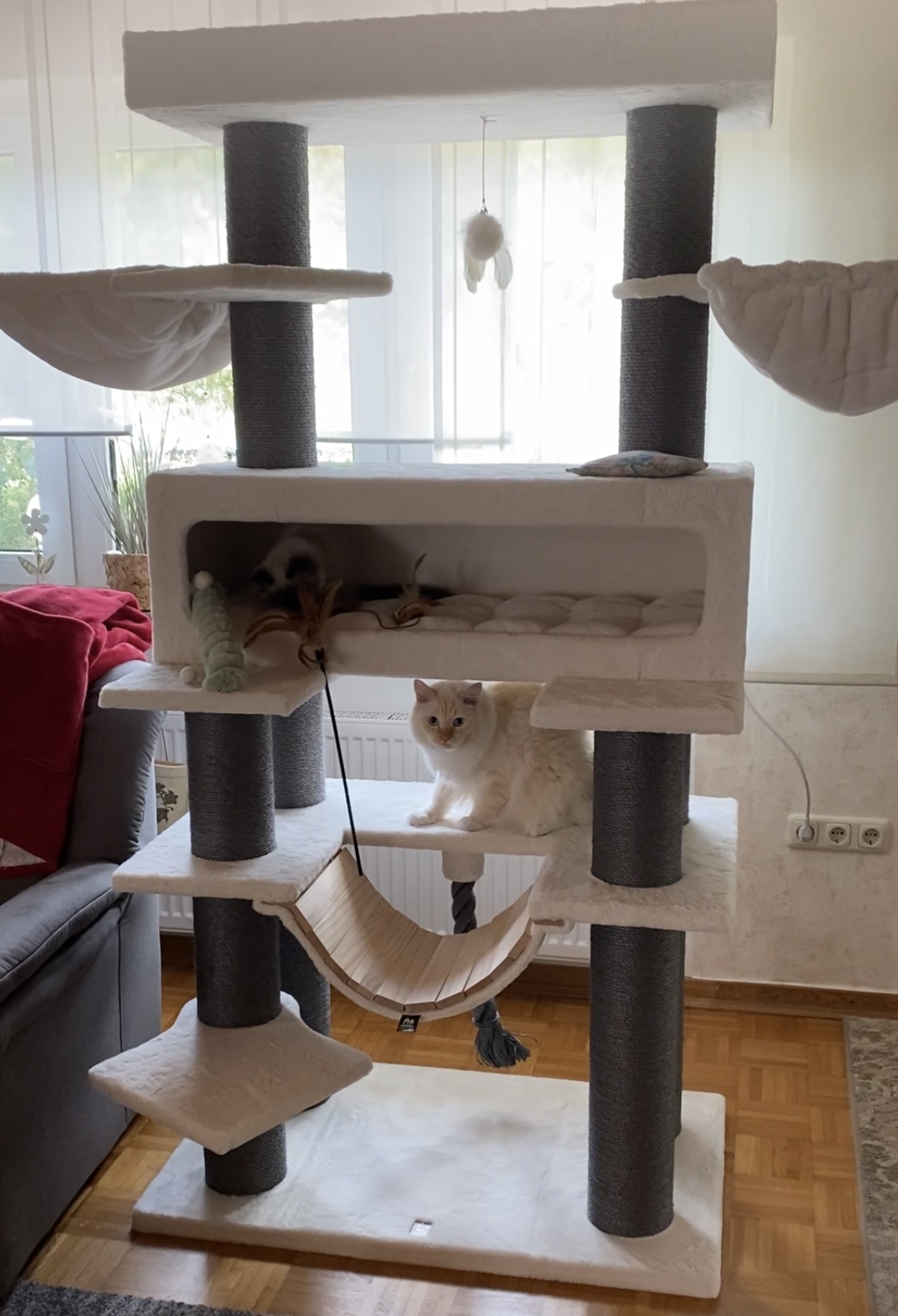 Der stabilste Kratzbaum, den ich je hatte 🙂 Dazu wünderschön und eine Bereicherung für jedes Wohnzimmer. Die Hängematten und die breite Wohnhöhle sehen so kuschelig aus, dass man am liebsten selber eine Katze wäre 🙂 Der Aufbau alleine für mich als Frau war auch machbar.