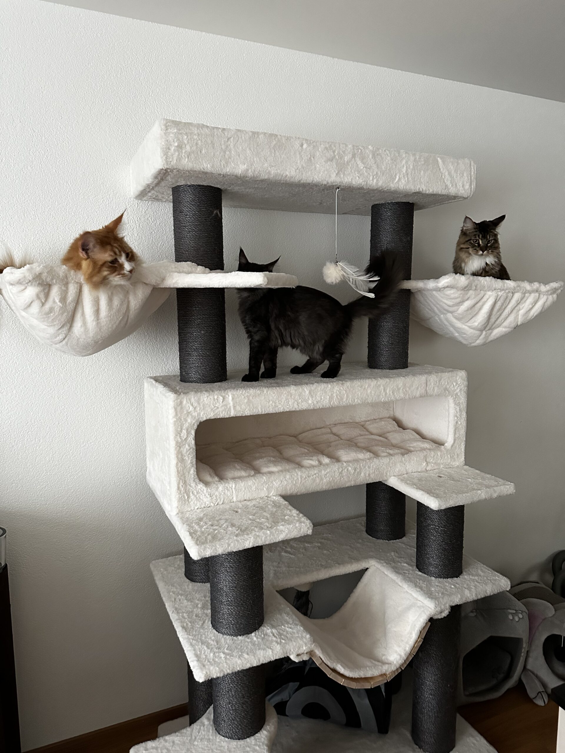 Der Kratzbaum sieht nicht nur äusserst schick aus, er ist auch unglaublich stabil. Selbst wenn meine fünf Maine Coon Katzen gleichzeitig darauf herumturnen wackelt er kein bisschen. Die riesigen Mulden und grosszügigen Betten sind sehr beliebt – endlich ein Kratzbaum der meinen fünf Riesen gerecht wird.