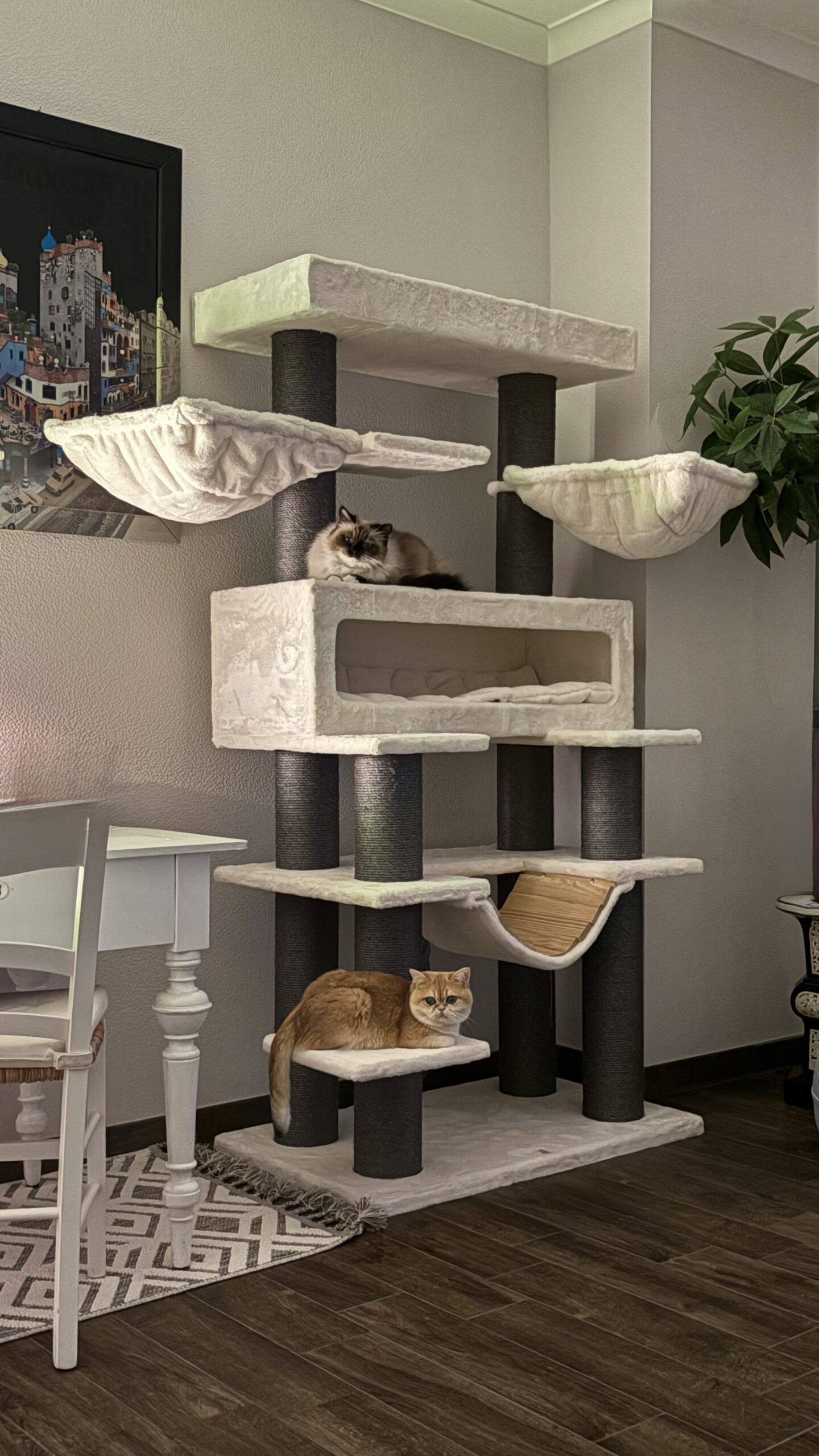 Der Kratzbaum ist solide und sehr schön gemacht. Es ist auch stabil. Die Sisal-Kratzelemente sind groß und das Haus und die obere Plattform bieten Platz für viele Katzen. Ich habe zwei Katzen und der Kratzbaum scheint ihnen zu groß zu sein. Die Hängematten sind groß, sodass meine Katzen bequem darin liegen können.