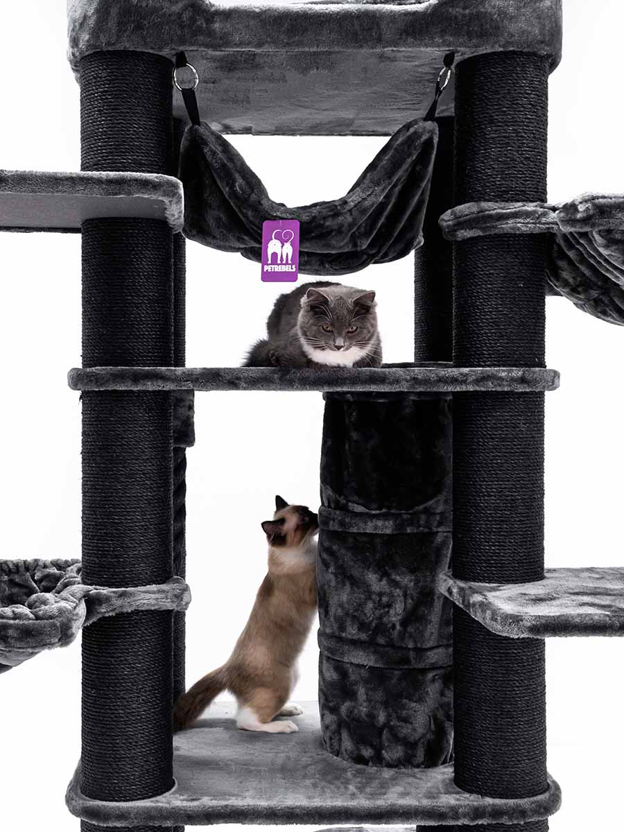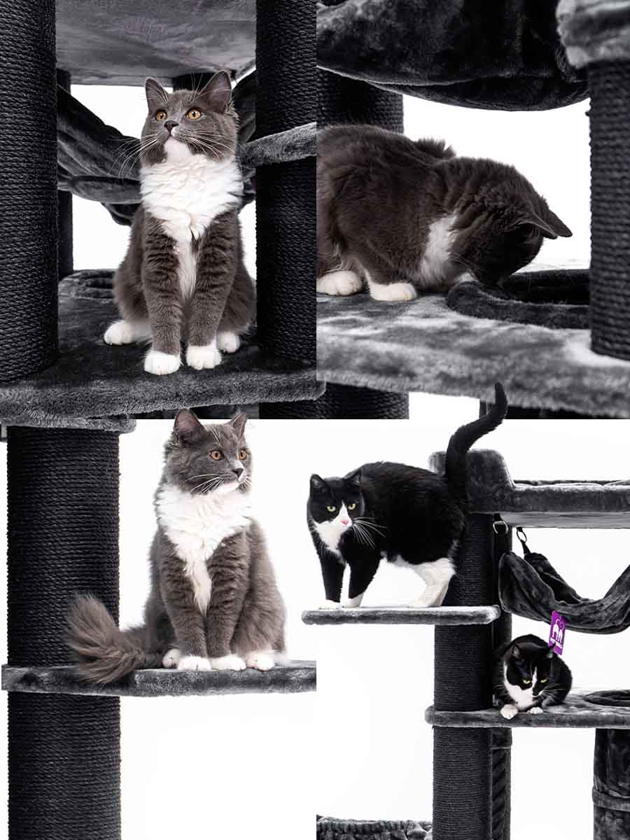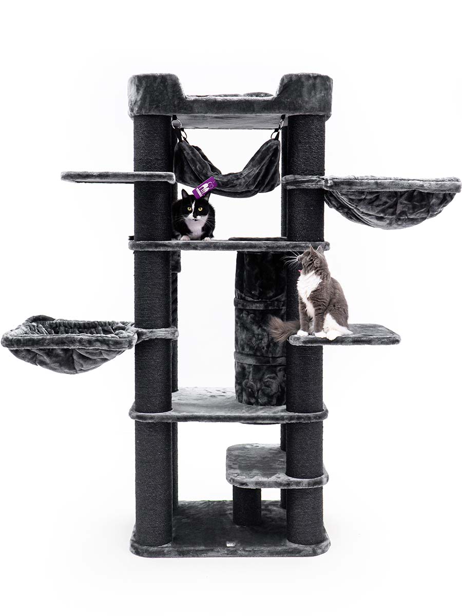 Und wir haben ihn wieder einmal verbessert, sprich verbreitert um deinem Rebellen noch mehr Platz zu bieten. Es wurden auch zusätzliche Plattformen hinzugefügt, damit selbst ältere Rebellen das XXL-Loungesofa auf dem Kratzbaum leicht erreichen können. Es gibt einen guten Grund, warum wir diesen Kratzbaum nicht loswerden können. Die superstabile Konstruktion in Kombination mit einer Fülle von sisalbezogenen Stämmen und weichen Hängematten macht diesen Kratzbaum ideal für die größten Katzen wie Maine Coons und Norwegische Waldkatzen. Als Sahnehäubchen hat dieses Möbelstück einen einzigartigen Spieltunnel, sodass deine Katzen sich nie langweilen werden.