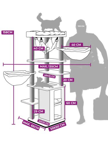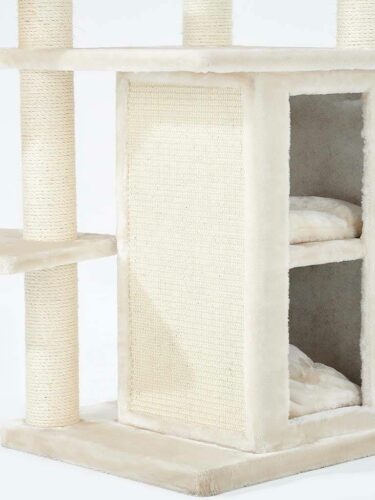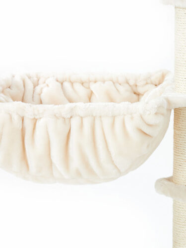 Das ist es, was jede Katze will – einen Kratzbaum (oder Kratzturm), der fast so hoch ist wie die Besucher. Denn von der Plattform oben, die mit samtweichem Plüsch bezogen ist, kann deine Katze alles im Auge behalten. Aber das ist noch nicht alles. Dieser Super-Deluxe-Kratzbaum hat auch schöne hohe Kratzstämme zum Klettern, einen Kratzstamm mit einer zusätzlichen Schlafplattform und nicht weniger als drei Hängematten für einen wunderbaren Schönheitsschlaf!