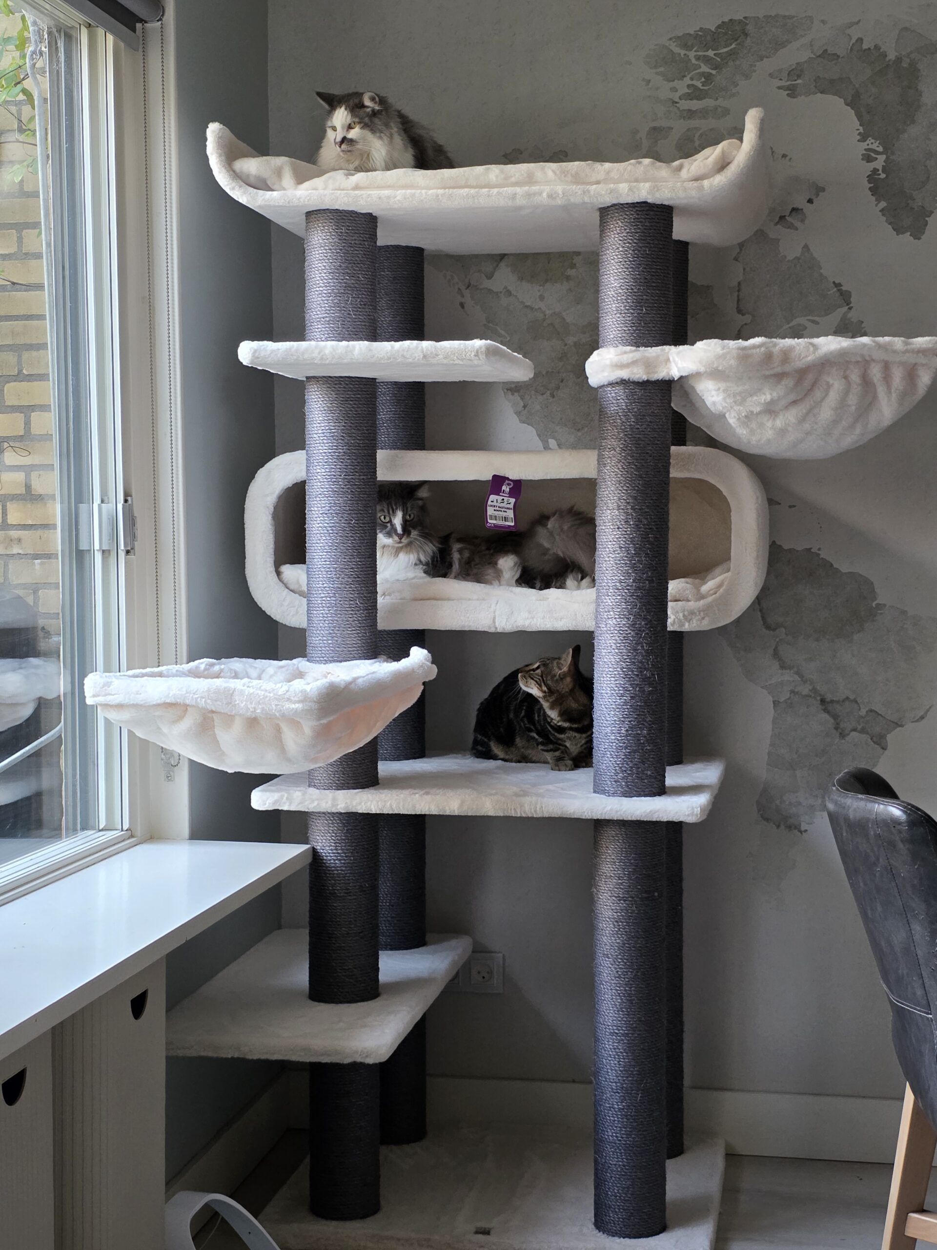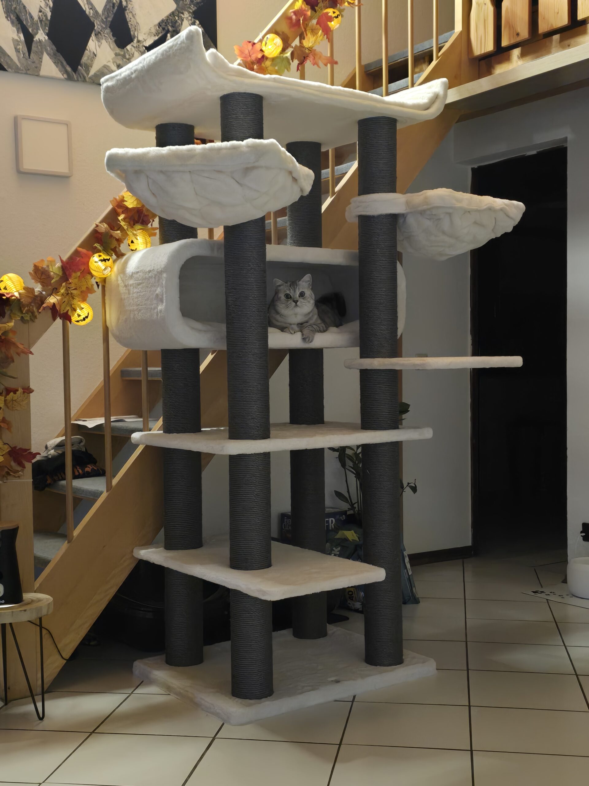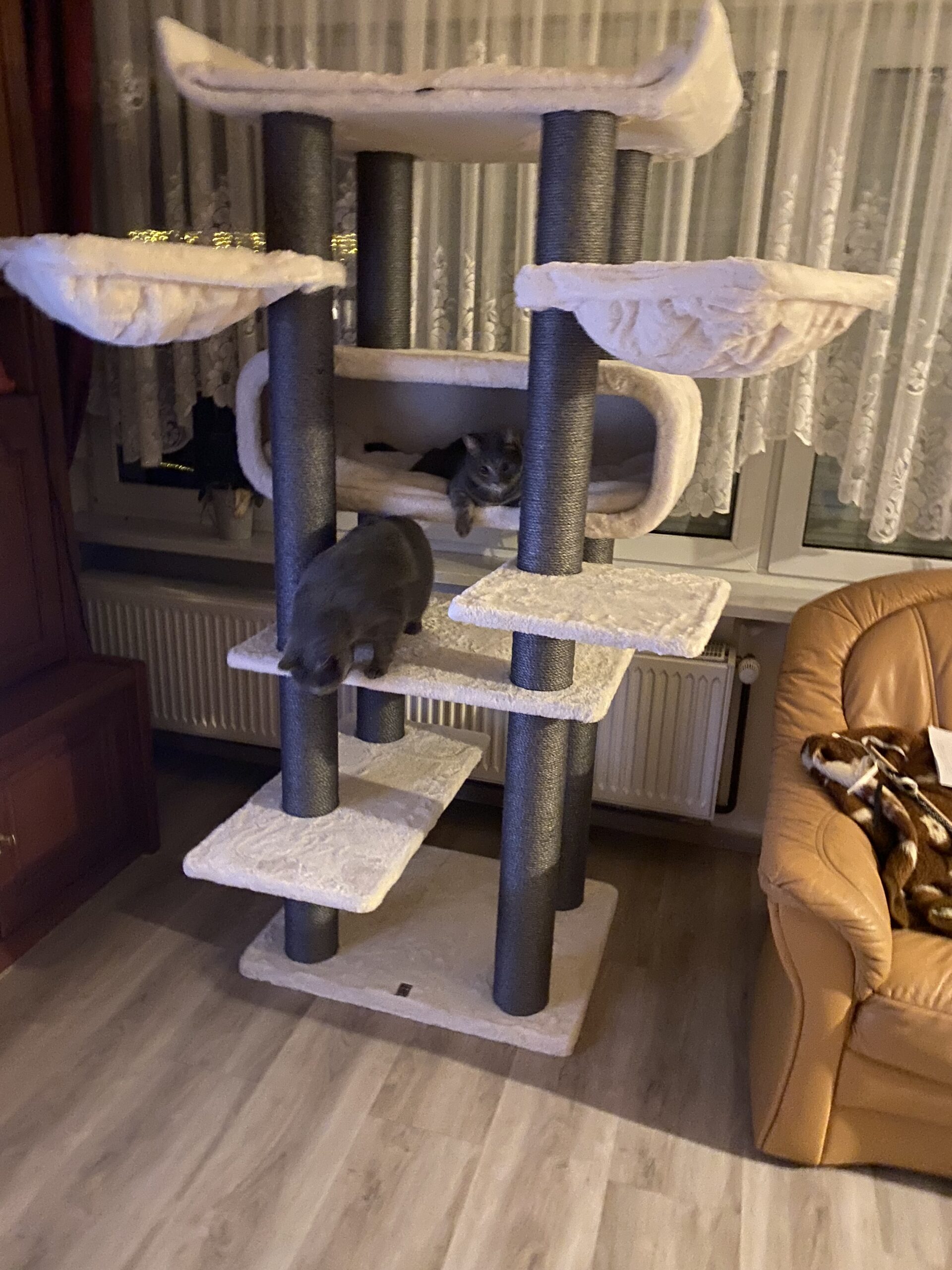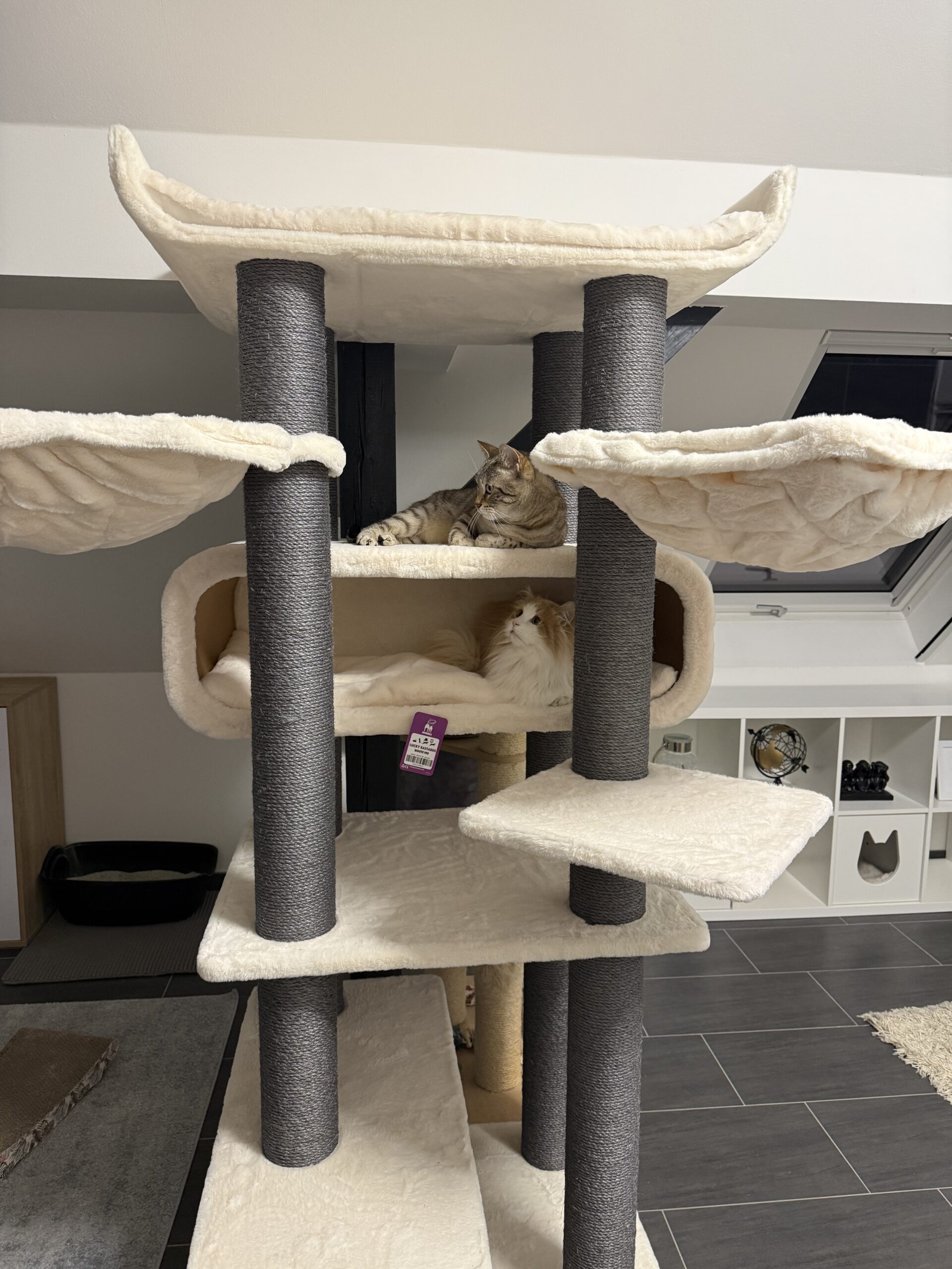 Livraison rapide, Arbre à chat superbe (coloris Off white) Qualité au top je suis très satisfaite de mon achat (Seul remarque, les hamacs déhoussable c’est top mais pour y arriver il faut dévisser les poteaux en sisals)
