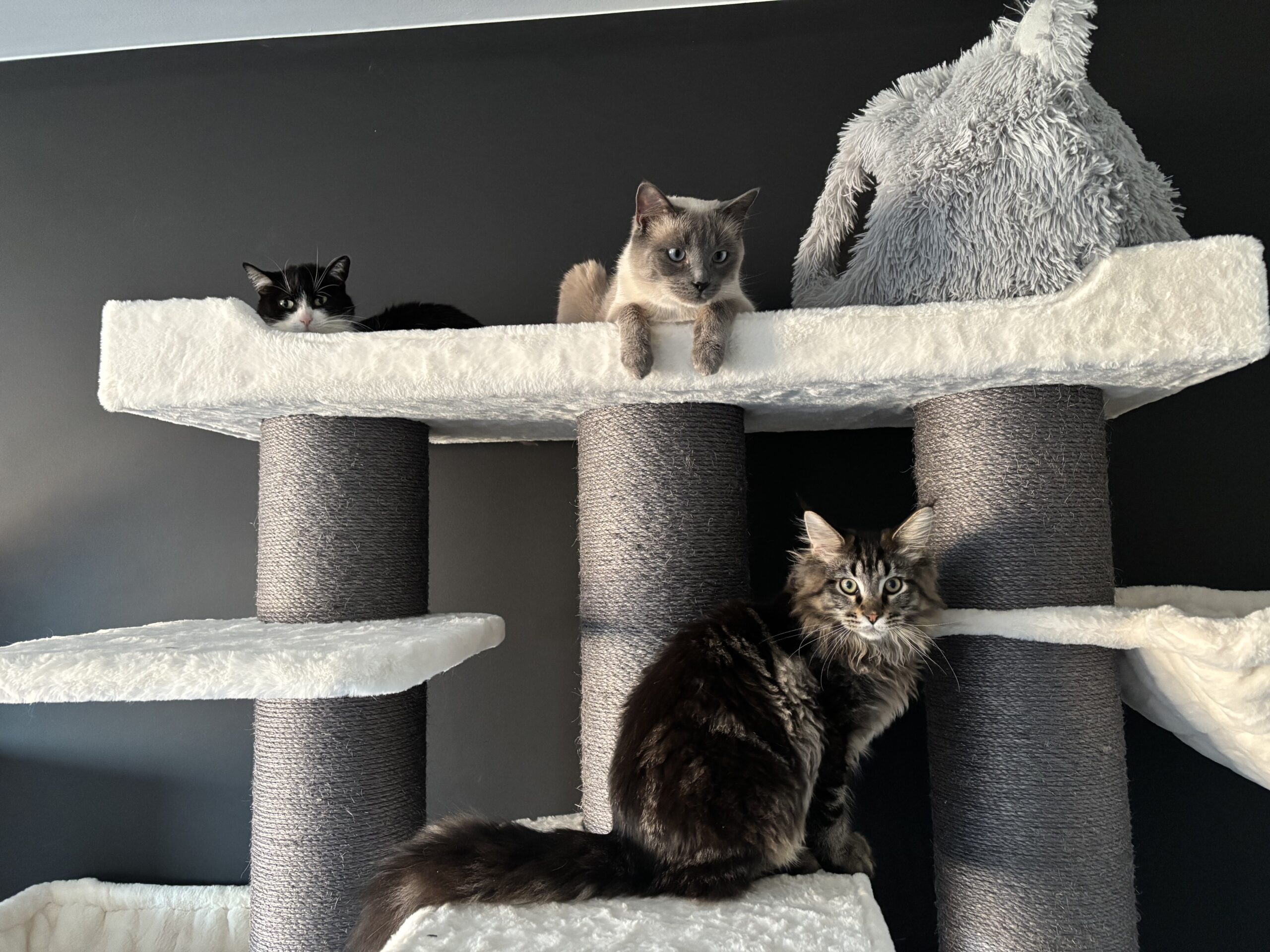 Der Kratzbaum ist einfach spitze!! Shira und Smokey waren beim Aufbau schon nicht zu stoppen. Jeder hat seinen Platz und die große Liegefläche ganz oben ist super! Jeden Cent wert!!