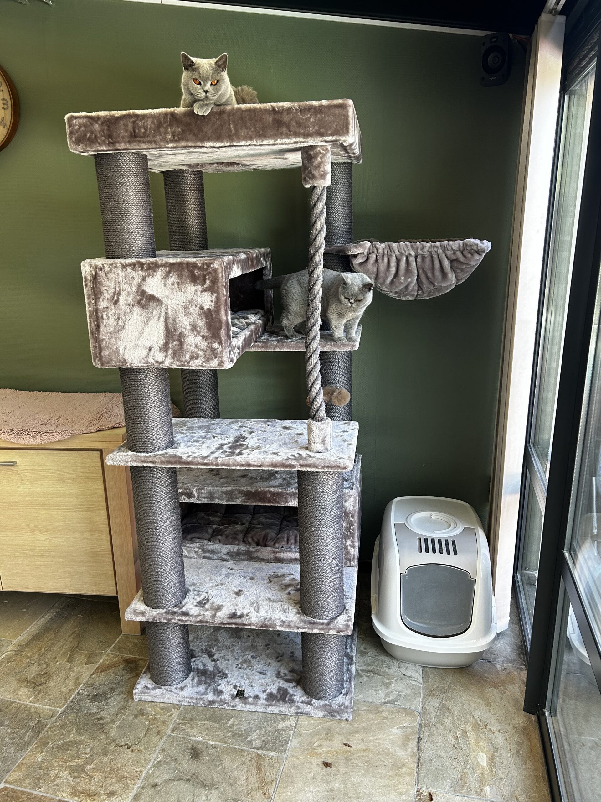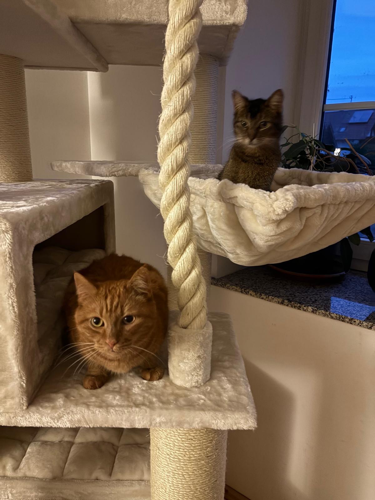 schöner, massiver Kratzbaum. hat ein bisschen gedauert, bis meine zwei ihn akzeptiert haben, aber jetzt lieben sie ihn