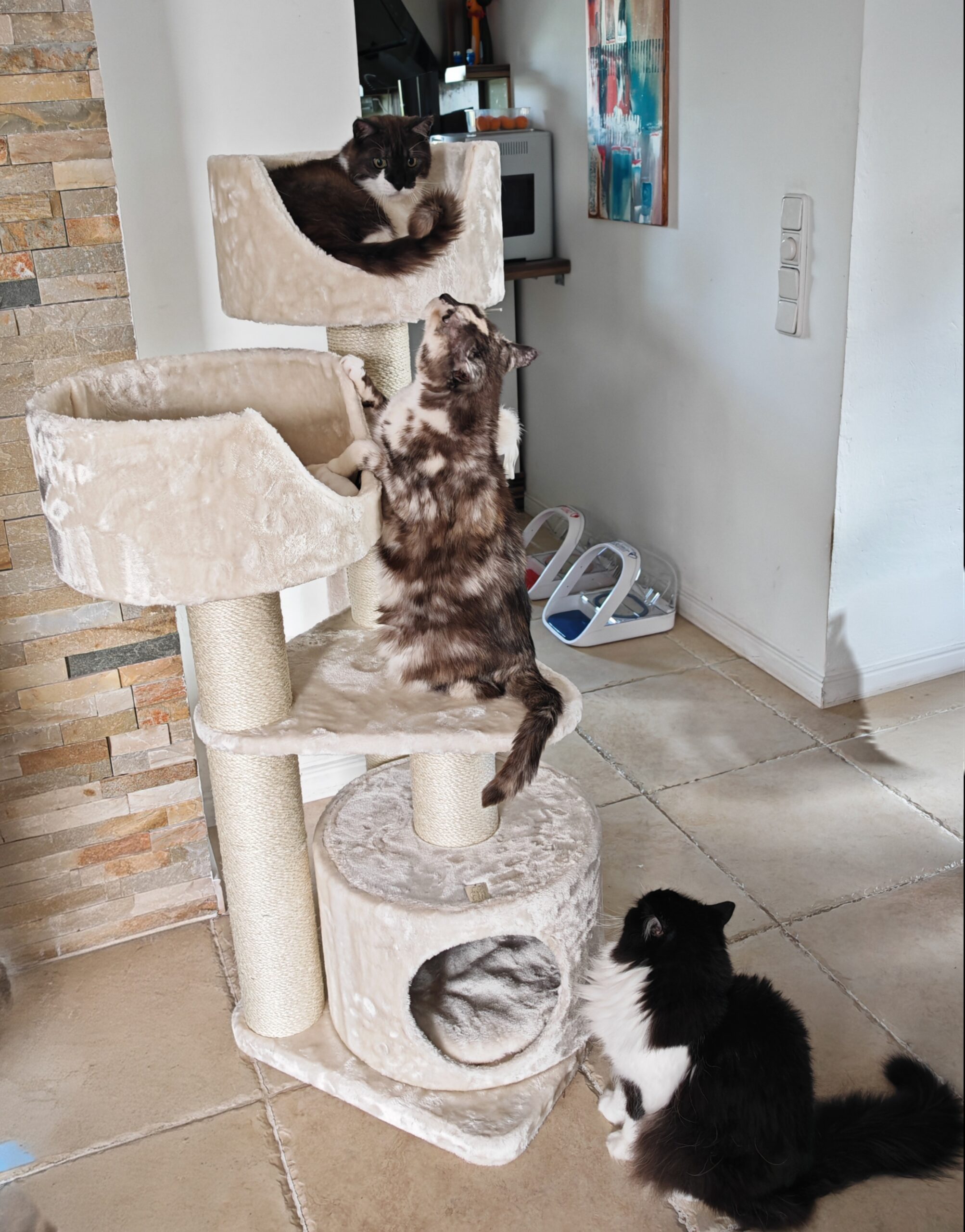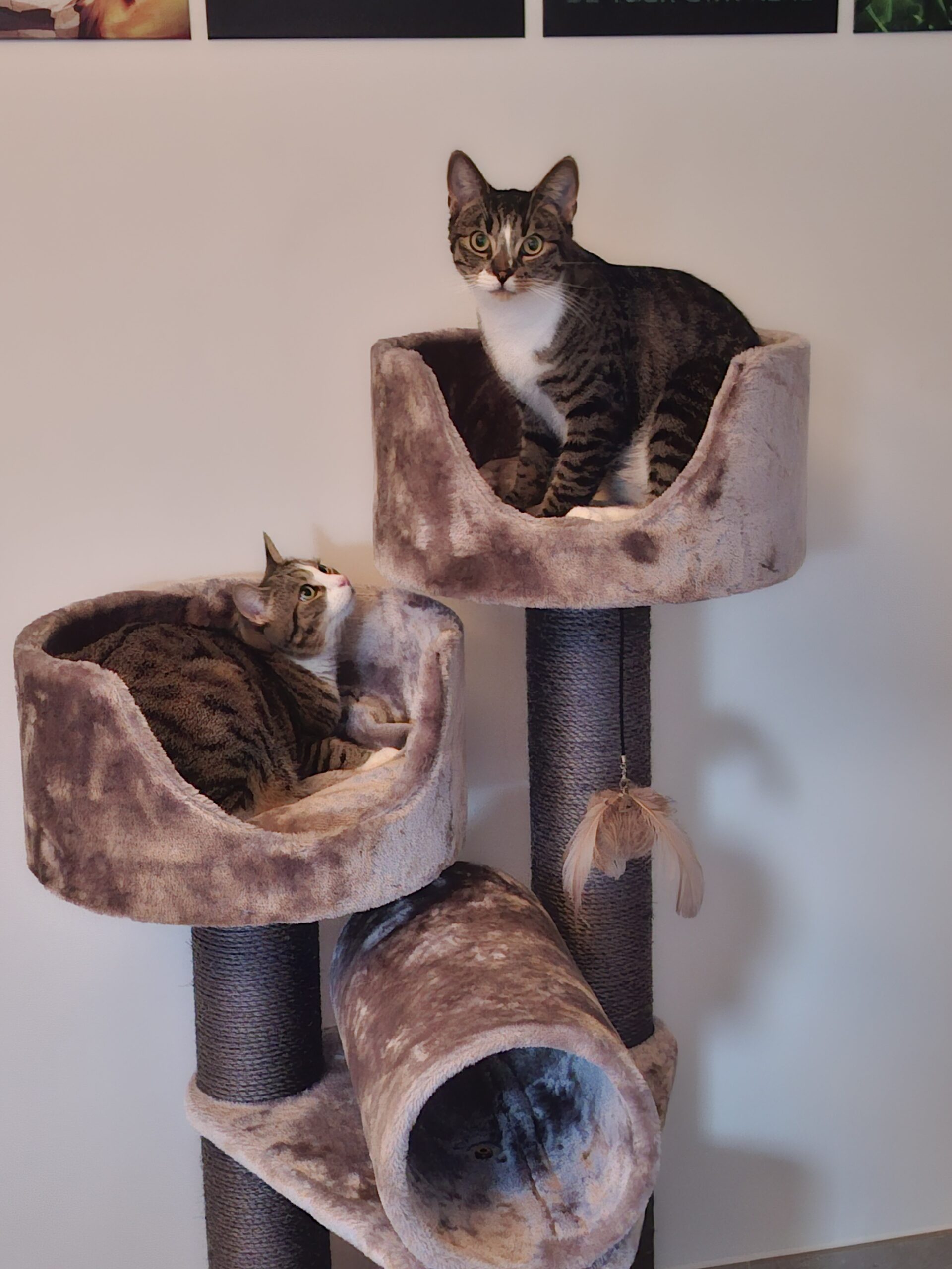 2 der 3 Fellnasen haben sich sofort über die neuen Kratzbäume hergemacht und sind begeistert.
