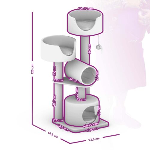 Wenn du auf der Suche nach einem extravaganten Katzendomizil für deine Katze bist aber nicht so viel Platz hast, dann kann deine Suche hier wohlmöglich enden. Denn unsere Victoria 125 überzeugt in Katzenanspruch, Design und Platzbedarf. Sie bietet eine Vollaustattung mit 12 cm dicken Kratzstämmen, superweichem Plüsch und 2 Loungesofas mit extra hohen Seitenteilen. Mit einem Spieltunnel, einem extra Spielzeug und einer gemütlichen Schlafhöhle ist das Kratzmöbel komplett sonderausgestattet. Unterhaltung, Abwechslung und ausreichend Platz auf kleiner Fläche.