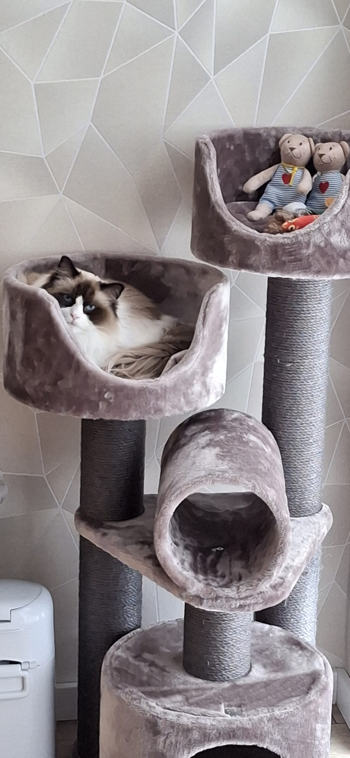 Uiteindelijk voor dit model gekozen, omdat het nog compact is en dus niet veel plaats inneemt in de woonkamer en ook geschikt is voor meerdere katten omwille van de verschillende sofa's.
