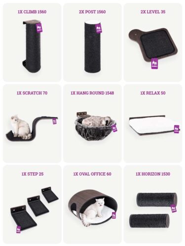 In diesem Kletterparadies haben Ihre Katzen keine Zeit, still zu sitzen. Ihre Stubentiger haben die Qual der Wahl: ob sie die sicheren Stufen hinaufklettern, von den Horizontstämme springen oder die Kletterstämme in einem Rutsch hinaufklettern. Dann gönnen Sie Ihren Katzen eine kurze Pause vom Wohnzimmerterror, indem Sie sie an dem Kratzteppich des Scratch 70 wetzen lassen. Aber selbst die energiegeladensten Katzen müssen sich ab und zu ausruhen. Werden sie sich für das gemütliche Oval Office, die Relax 50 oder die Hängematte Hang Round 1548 entscheiden? Dieses Kombinationsset bietet Ihren Katzen fast zu viele Möglichkeiten.
