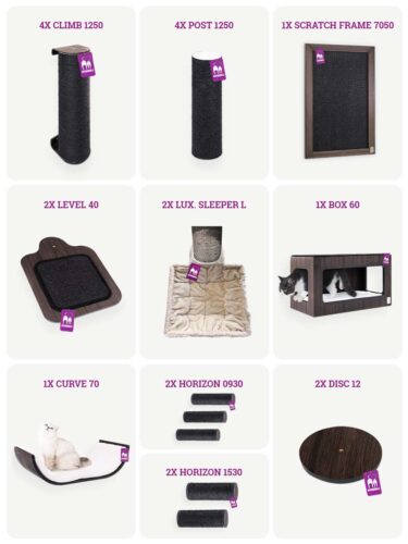 Das größte und coolste Set in unserem Sortiment! Mit diesem Kombinationsset haben Sie fast unendlich viele Möglichkeiten, Ihre Träume wahr werden zu lassen. Das klingt vielversprechend, und das aus gutem Grund. Diese Katzenwand bietet eine Vielzahl von Klettermöglichkeiten. Ihre Katzen können nicht nur über die 10 Horizon-Stämme jeden Punkt in diesem Set erreichen, sondern auch über die Climb 1250-Sisalstämme. Ärger mit scharfen Krallen? Kein Problem! Dieses Set bietet sowohl horizontale als auch vertikale Kratzmöglichkeiten. Klettern und Kratzen macht müde, deshalb gibt es in diesem Kombi-Set mehrere schöne Schlafplätze. Von Katzenexperten mit Blick auf den Komfort für Katzen entworfen, ist es perfekt für Rebellen, die gerne stilvoll klettern, kratzen und entspannen!