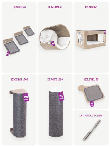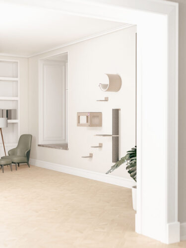 Berücksichtigen Sie dabei die Größe und Kletterfähigkeit Ihrer Katze(n). Haben Sie kleine Katzen oder haben sie Schwierigkeiten beim Klettern? Wenn ja, hängen Sie die Teile eng zusammen. Haben Sie große, energiegeladene Katzen? Dann sollten Sie die Teile weiter auseinander hängen.