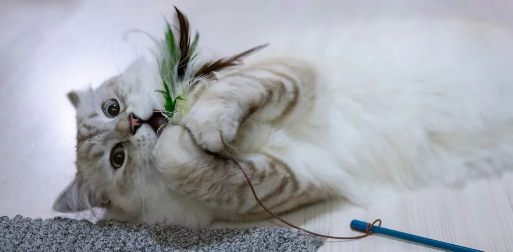 Is your cat bored during the day? Make them happy with a fun companion. Play actively with your cat multiple times a day – about 3 times for 5 minutes is enough. Rotate different cat toys and make the play challenging: stimulate your cat’s hunting instinct and use feather wands. Or throw balls and toy mice and let your cat fetch them.