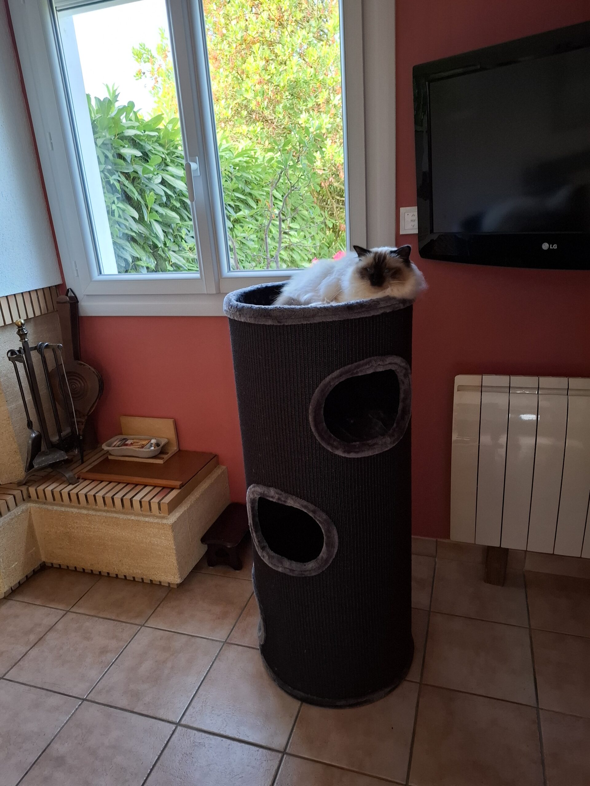 Très jolie colonne à griffer et de bonne qualité, j’en ai recommandé une seconde, je recommande. Par contre il y a un passage sur l’étage du milieu, du coup je pose le gros coussin dessus