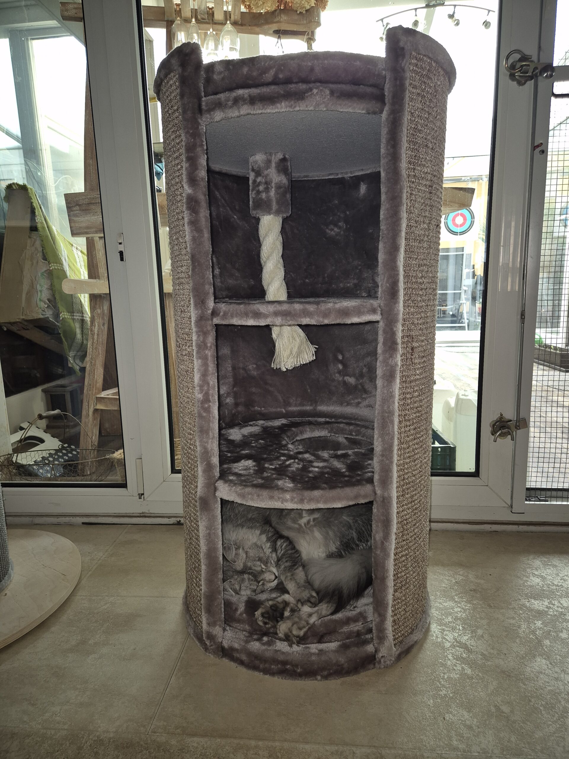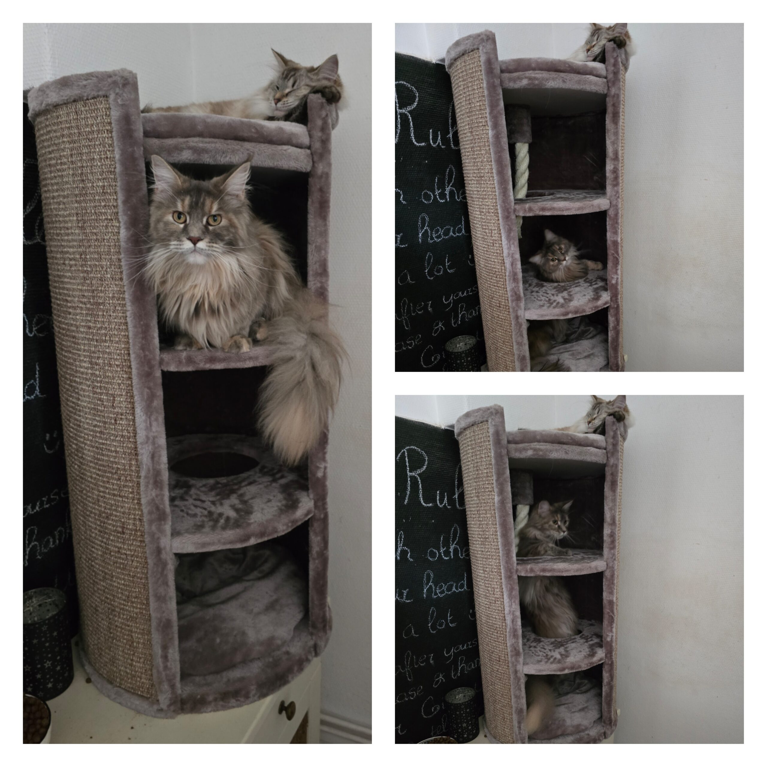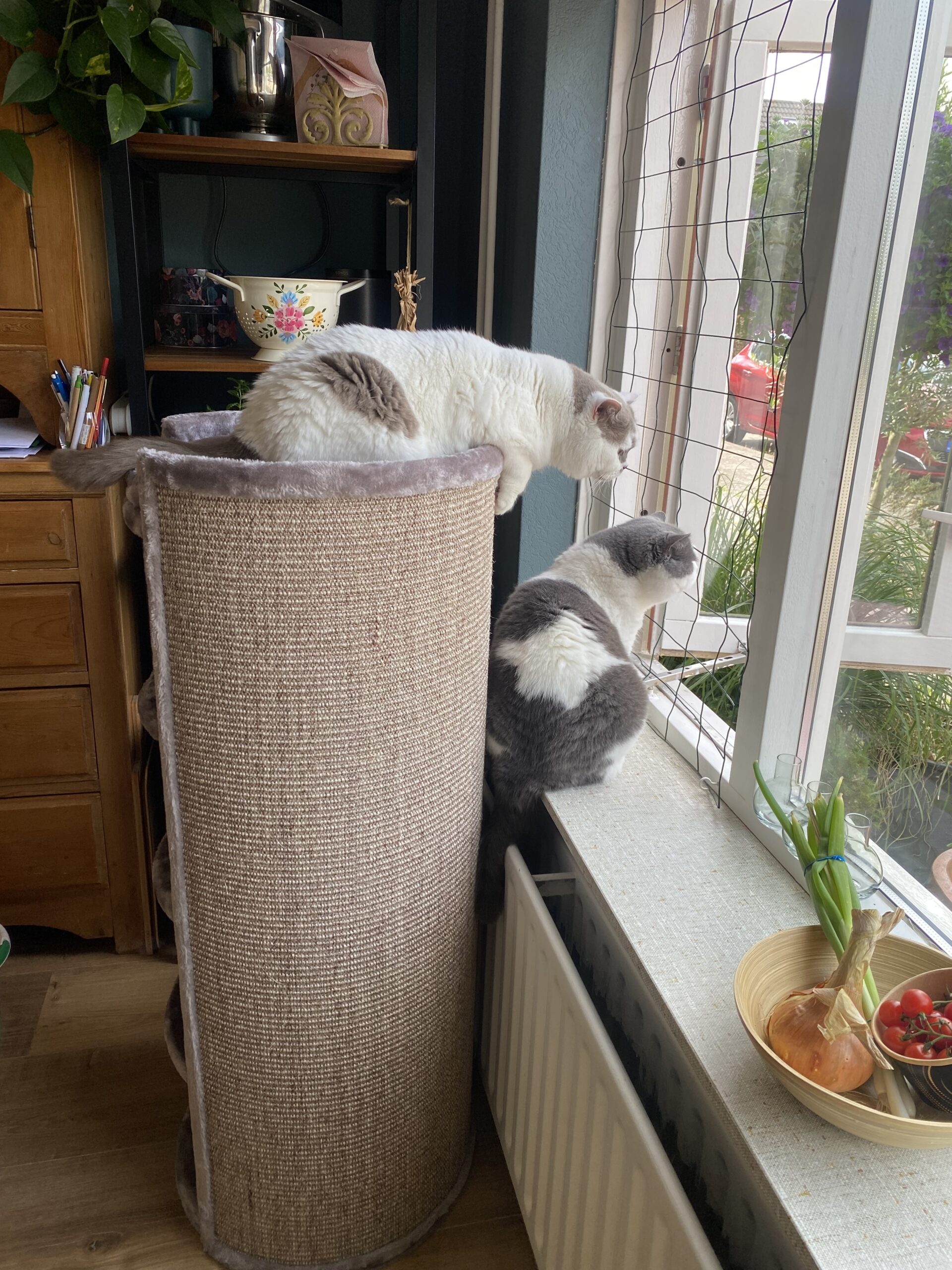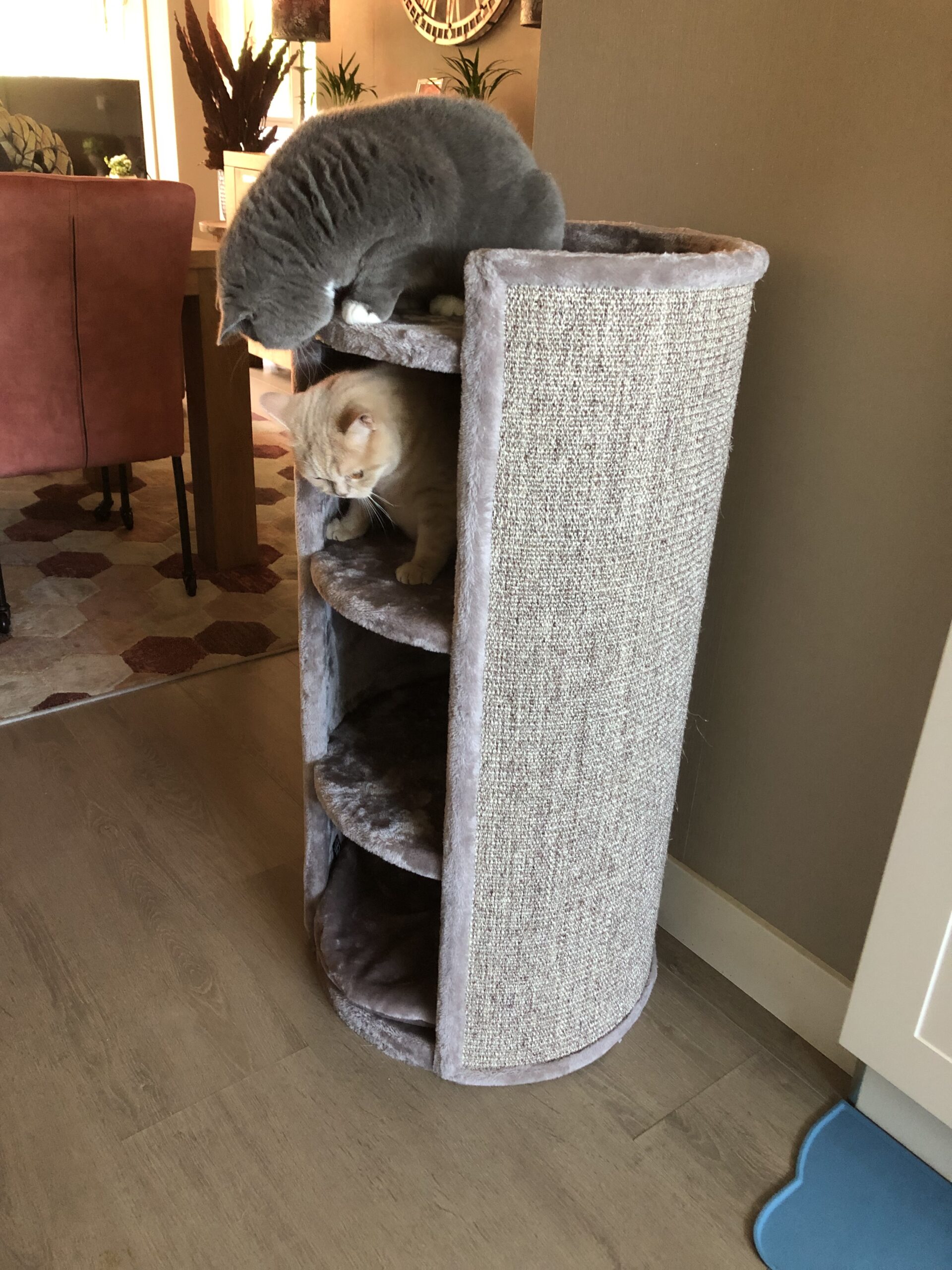 Sinds de krabton naast mijn bureau staat, liggen 2 von 3 poezen boven en kijken mij toe tijdens homeoffice. Ze komen nu minder vaak op de tafel. De krabton wordt ook tijdens de jacht genomen. Ze klimmen er zeer graag omhoog en weer naar beneden. Tot nu toe viel hij niet om.