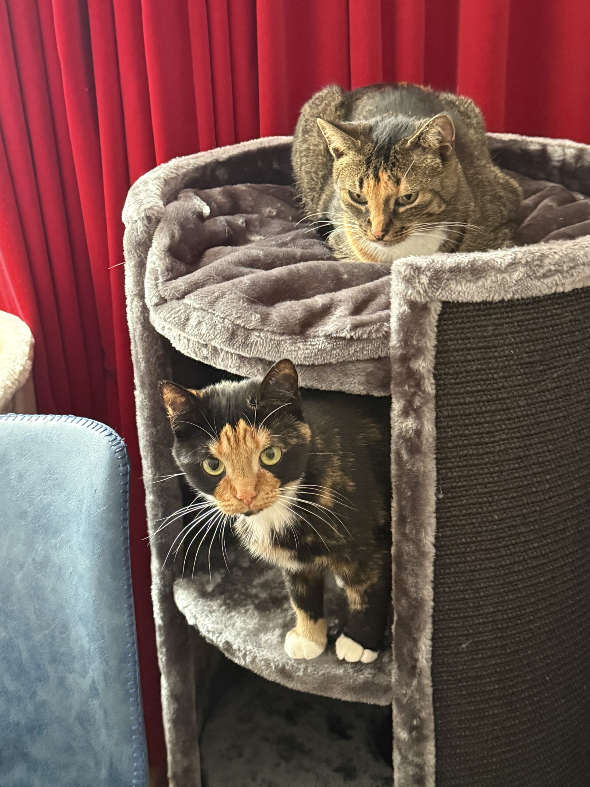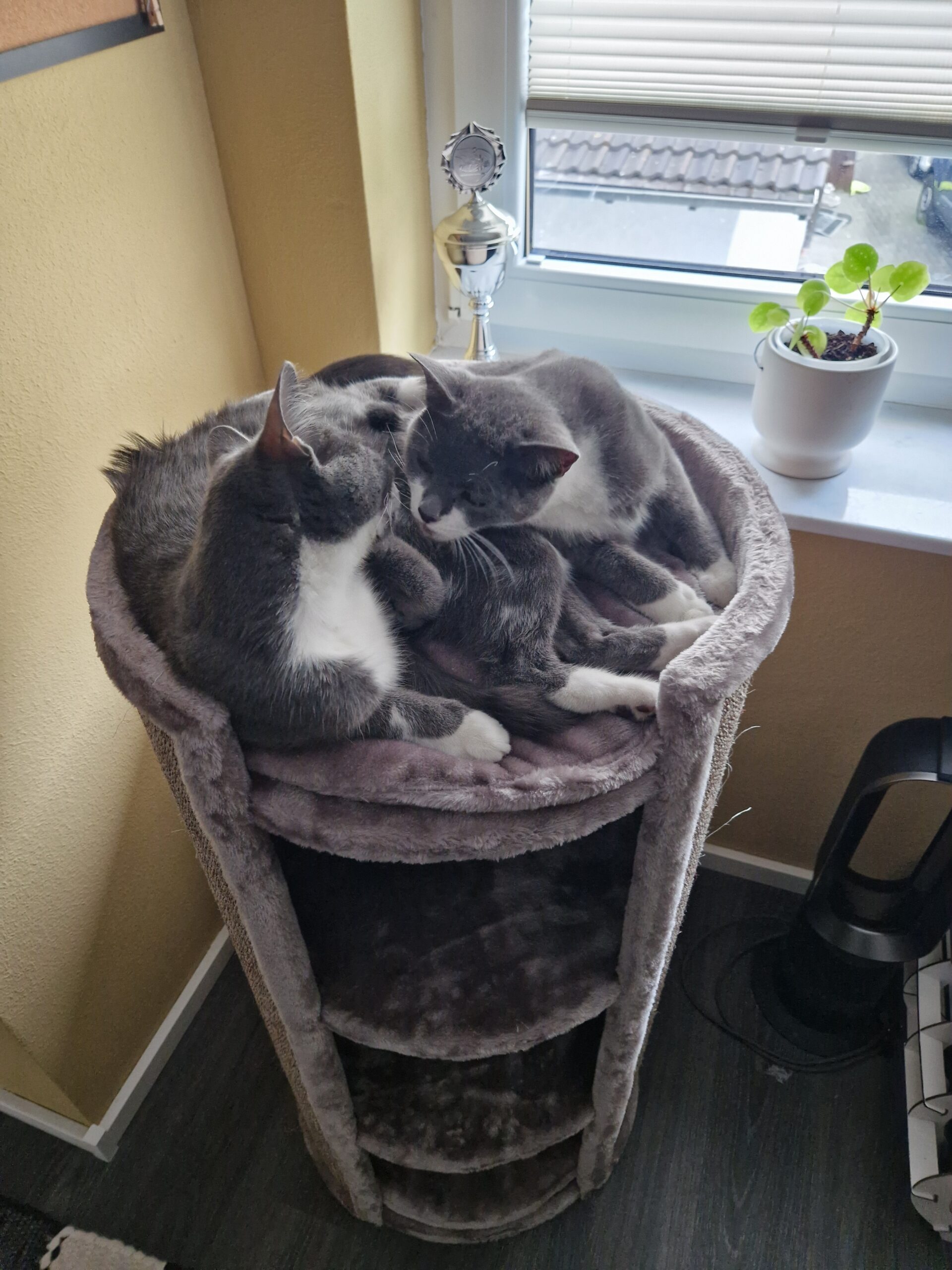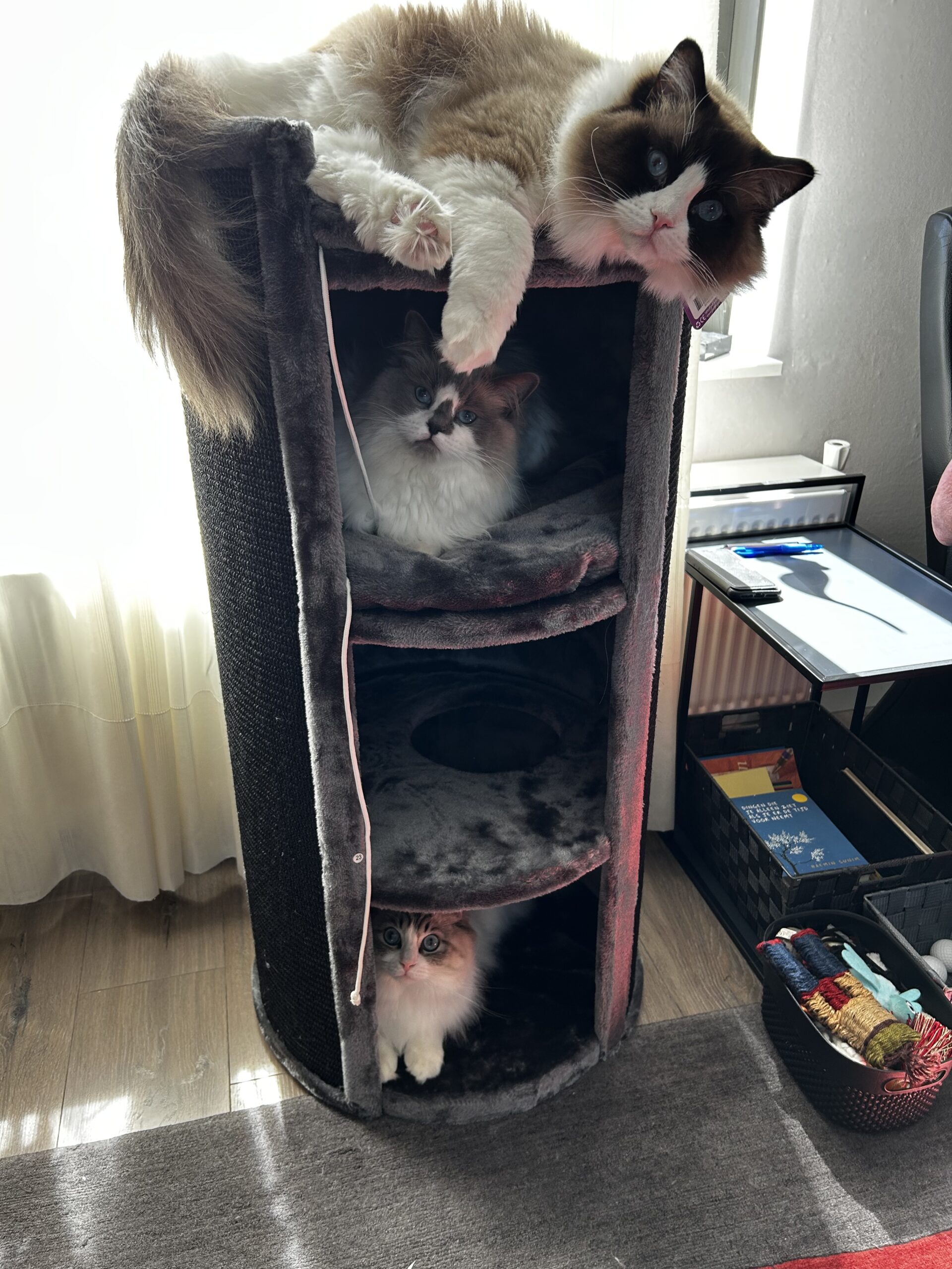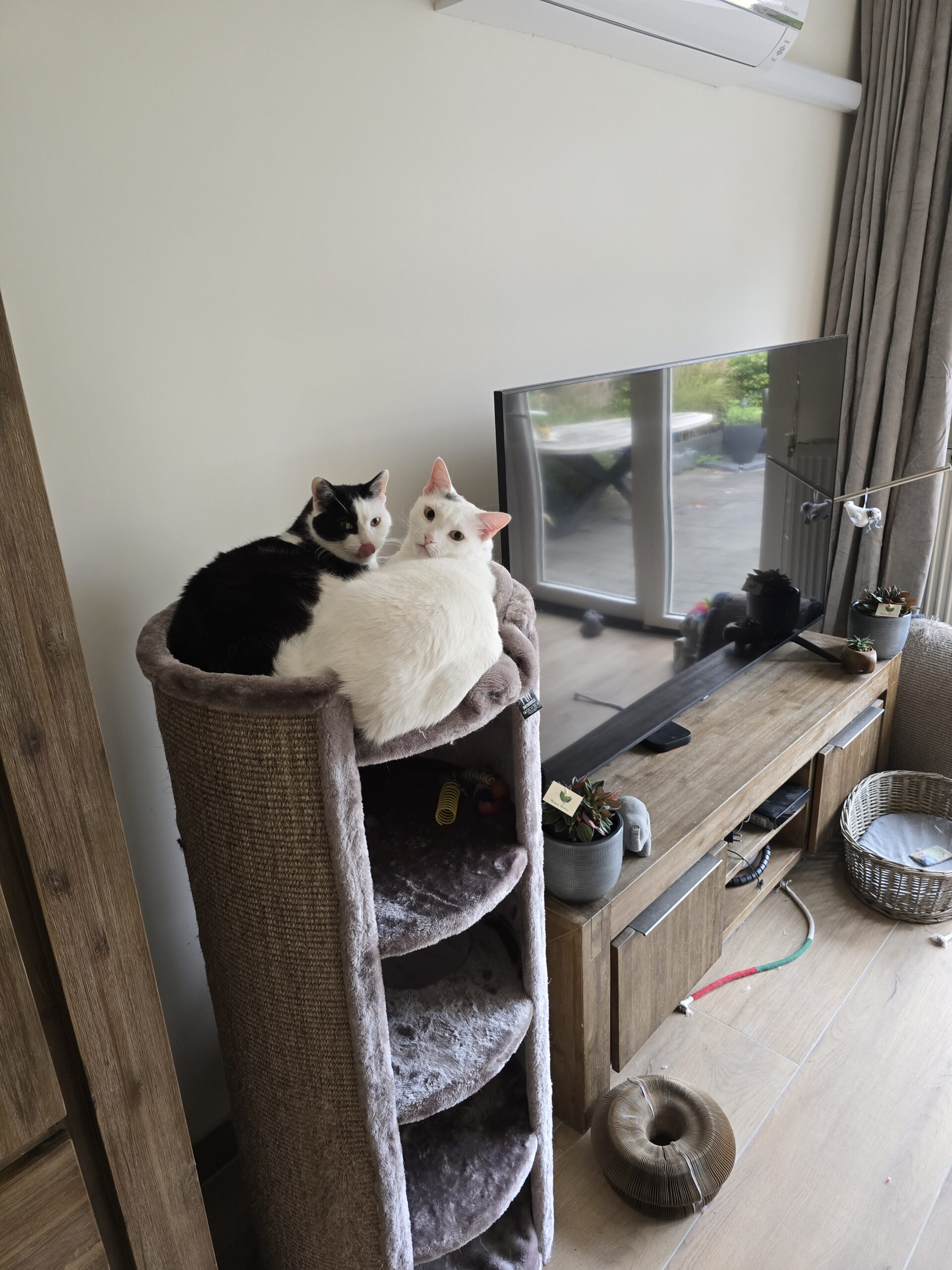 Sinds de krabton naast mijn bureau staat, liggen 2 von 3 poezen boven en kijken mij toe tijdens homeoffice. Ze komen nu minder vaak op de tafel. De krabton wordt ook tijdens de jacht genomen. Ze klimmen er zeer graag omhoog en weer naar beneden. Tot nu toe viel hij niet om.