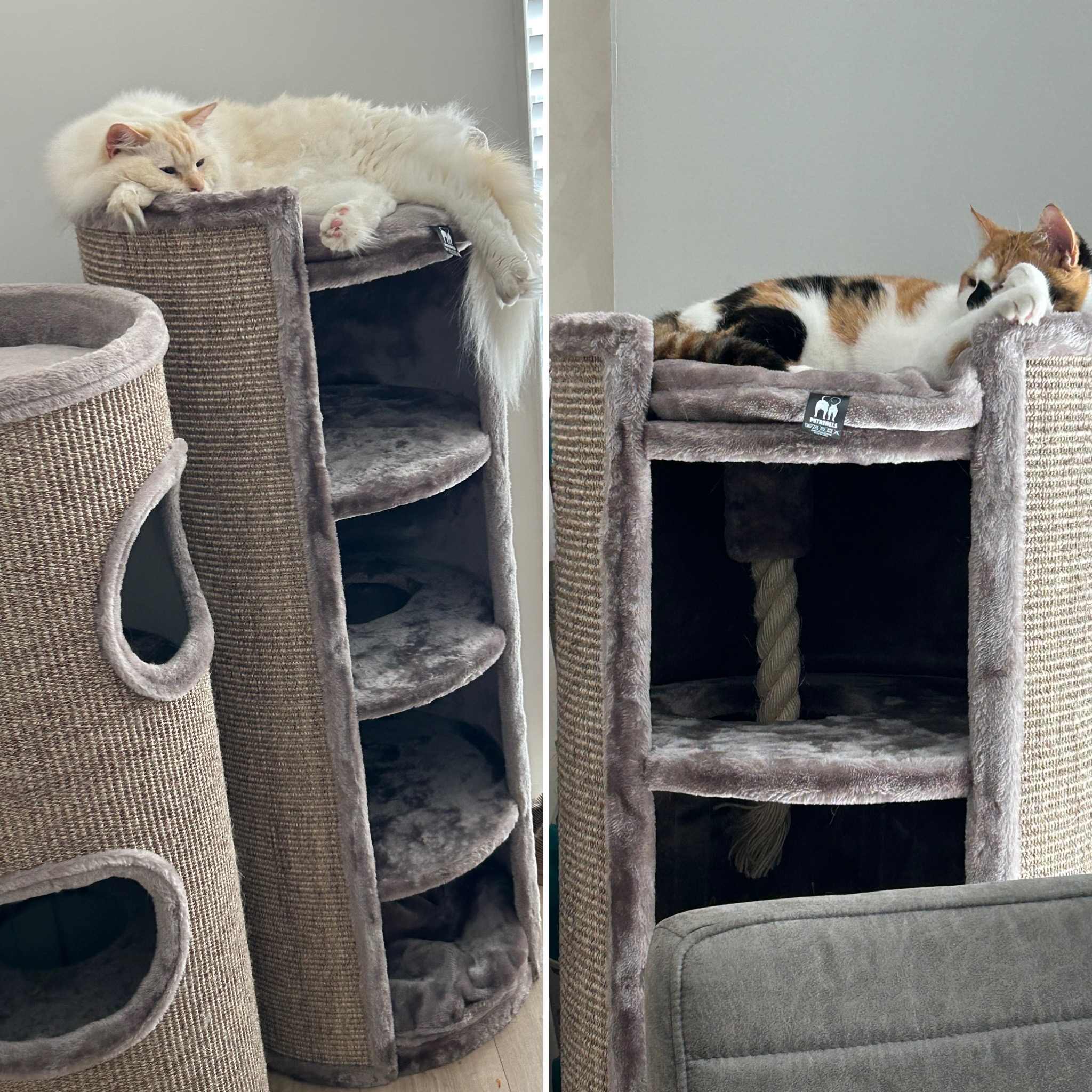 The design of the Superdome 120 was a piece of cake for our design team, because they incorporated everything cats love. Think of luxurious velvety plush, lots of shelves for multiple cats, a thick base for ultimate stability and a thick play rope for extra fun. And as the icing on the cake, a nice lounge area at the top that is also perfect for keeping an eye on everything and everyone. Lovely with two washable loose cushions.