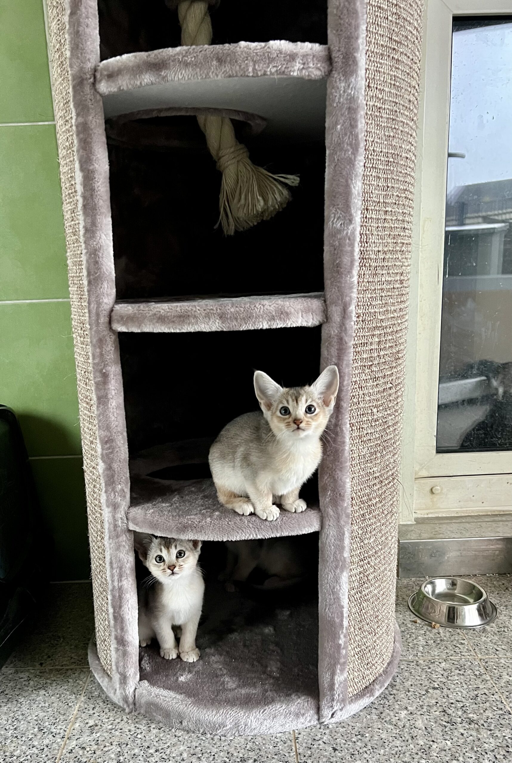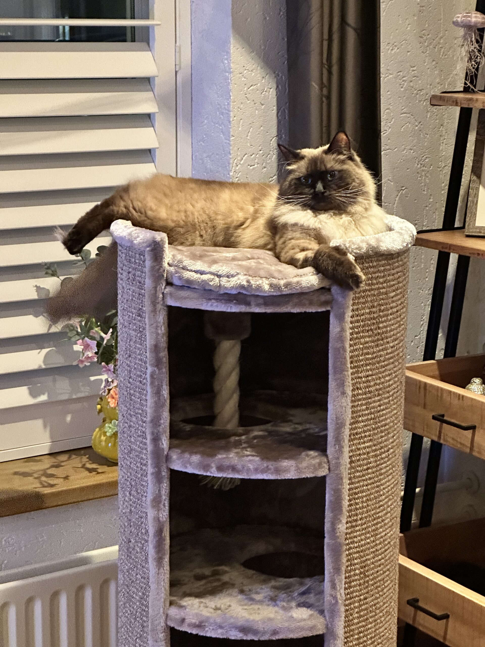 Sinds de krabton naast mijn bureau staat, liggen 2 von 3 poezen boven en kijken mij toe tijdens homeoffice. Ze komen nu minder vaak op de tafel. De krabton wordt ook tijdens de jacht genomen. Ze klimmen er zeer graag omhoog en weer naar beneden. Tot nu toe viel hij niet om.
