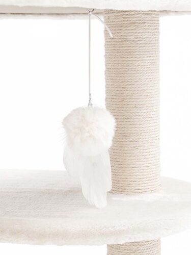 Très bon arbre à chat, il est de qualité. Lourd et solide, il convient à mon main coon. Le jouet suspendu a vite été arraché mais il est facilement remplaçable par tout autre jouet grâce à l’attache fixée sur la structure. Parfait.