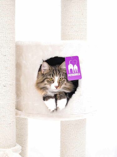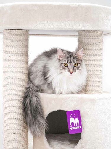 In eerste instantie zijn we in de showroom van PetRebels gaan kijken naar krabpaal Anna. Na overleg hebben we voor model Charlotte 180 gekozen omdat poes Sam daar veel meer aan zou hebben. Al tijdens het uitpakken was Sam geïnteresseerd in de krabpaal. Ze heeft de huisjes getest nog voordat de paal in elkaar zat en hielp mee met de schroeven aan te draaien 😉 Ik had verwacht dat het even zou duren voordat ze eraan gewend was, want ik heb al heel wat mandjes en kleedjes gekocht waar ze niets mee doet. Aan deze krabpaal begon Sam meteen te snuffelen en haar nagels te scherpen. Ze is een echte springer en dook enthousiast op het speeltje af. Dat schoot er een keer af met 3,5 kilo kat eraan, maar na een beetje verstevigen is ze er alweer uren zoet mee. Het mooiste plekje is tot nu toe bovenop, maar ook het hangmatje is een relaxt plekje.