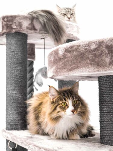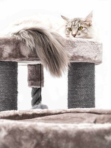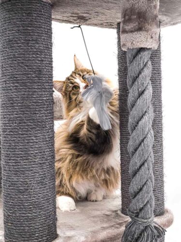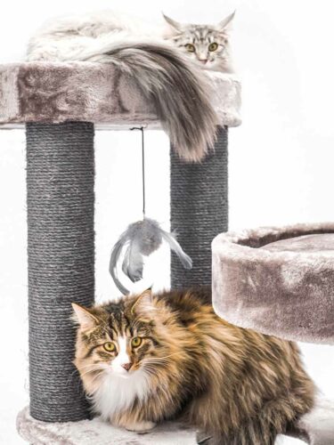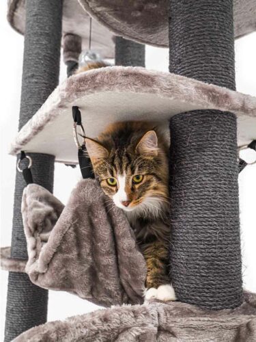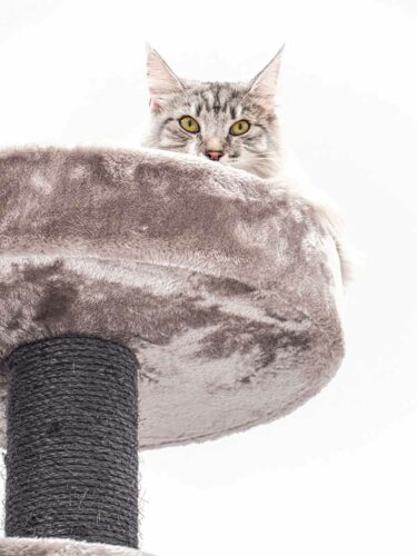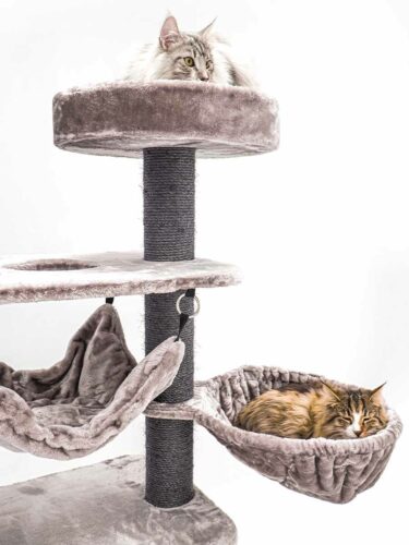 Wir haben zwei Mainecoon Mischlinge die sich sehr über ihren neuen Kratzbaum gefreut haben! Er ist sehr stabil,dicke Platten, dicke Stämme, leicht im Aufbau und fügt sich optisch sehr gut in den Raum ein. Die einzelnen Etagen sind auch gut für unseren großen ca. 8kg Kater zu erreichen. Der Plüsch ist dick und doppelt gelegt, so sind die Hängematte und der frei hängende Liegekorb weich und belastbar. Alles macht einen sehr hochwertigen Eindruck. Nicht mal das eingefärbte Sisal hat einen Geruch. Eine gute Investition!!! Im Namen unserer Fellnasen sagen wir Danke!