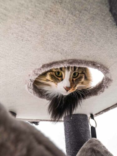 Ich habe die Hängematte weg gelassen – so können meine Katzen durch das Loch auf die nächste Etage springen! 🙂 Und zum Miteinander spielen ist es auch perfekt!