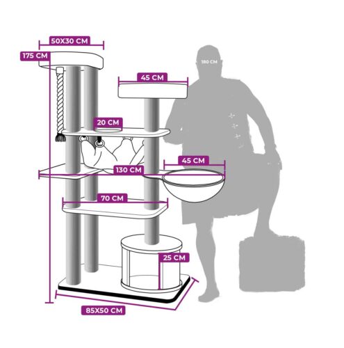 Cats love to scratch. And to climb, of course. So why not spoil your Rebel with the ultimate climbing paradise? We would like to introduce you to our cat tree Scenic View 175, one of the best in our collection. With scratching posts of 12 centimetres thick and many platforms, your Rebel will be entertained all day long. Have you become a little tired from all that playing? No problem, because with the two luxurious quilted hammocks, a sleeping house and two relaxing loungers on top, there is enough space to sleep.