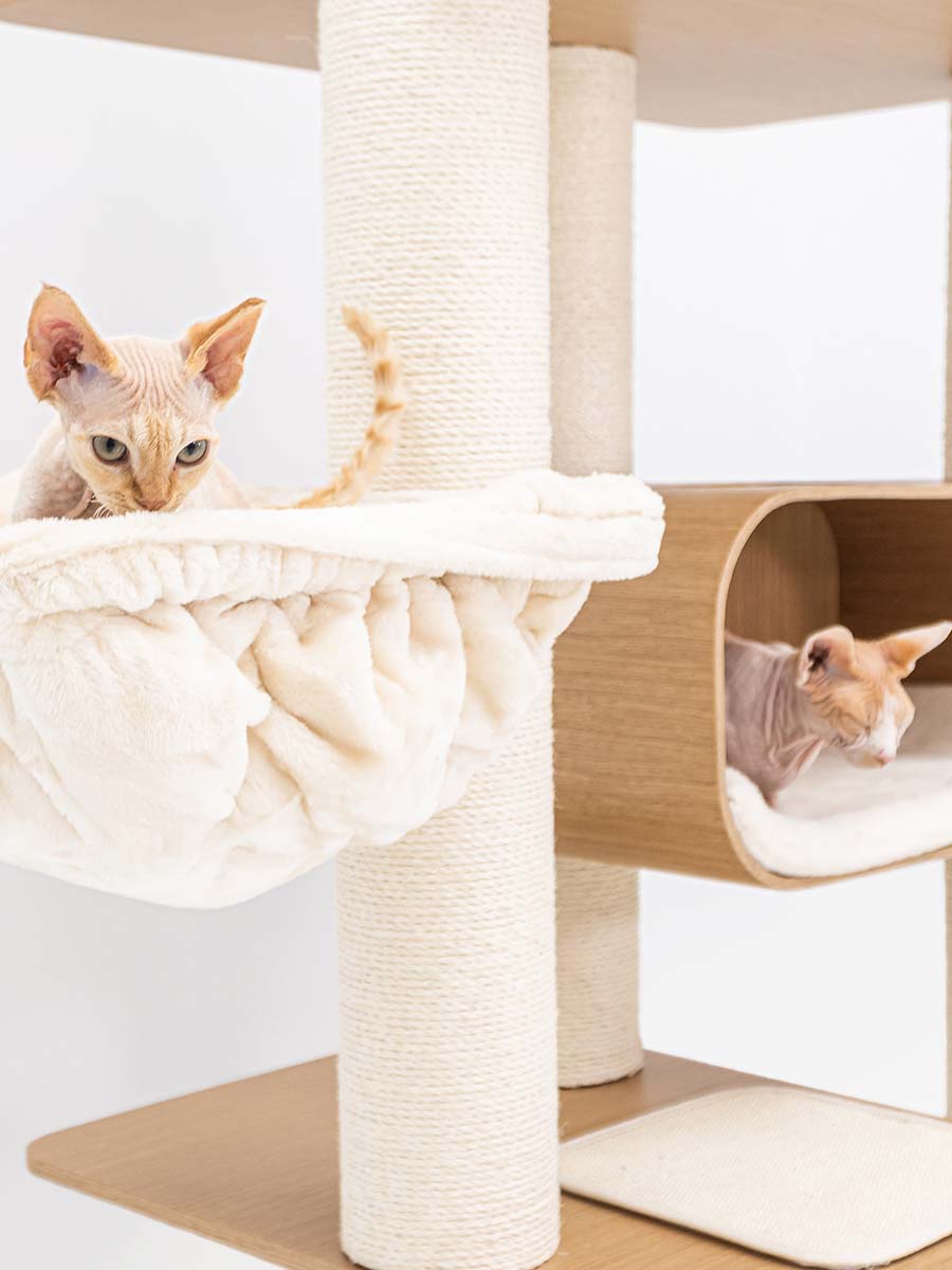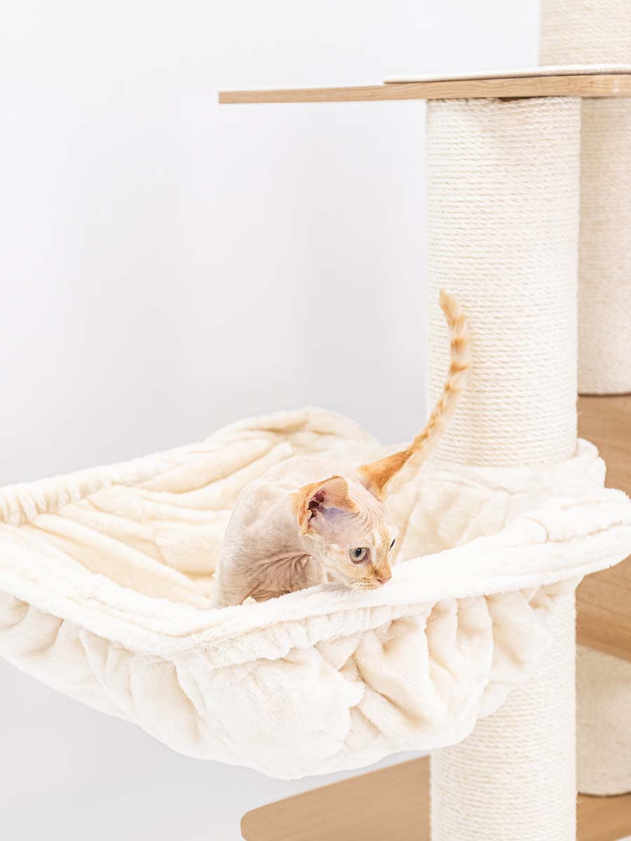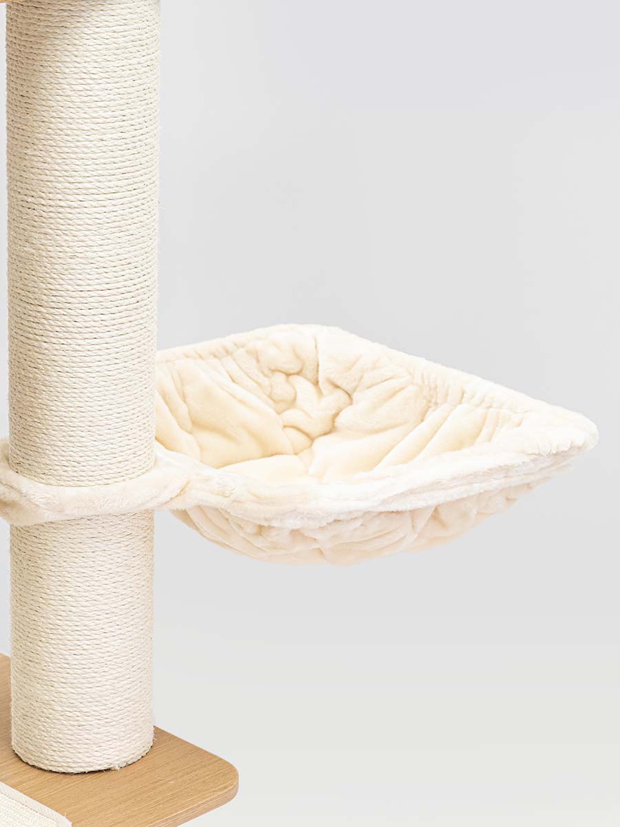 The Virgo 173 is truly a super-modern scratching post that looks great in your living room. This scratching post is tall and a real eye-catcher in your home – it is beautiful, luxuriously finished and, thanks to the matching colours, it fits in with any interior. But importantly of course, this scratching post is a treat for cats. Really everything your cat Nods is on it: an XXL lounge basket on top, two soft wash-out hammocks to relax in and a nice big cat house. All with soft plush and nice thick sisal to scratch on. This is the perfect scratching post for your cat! confidence is.
