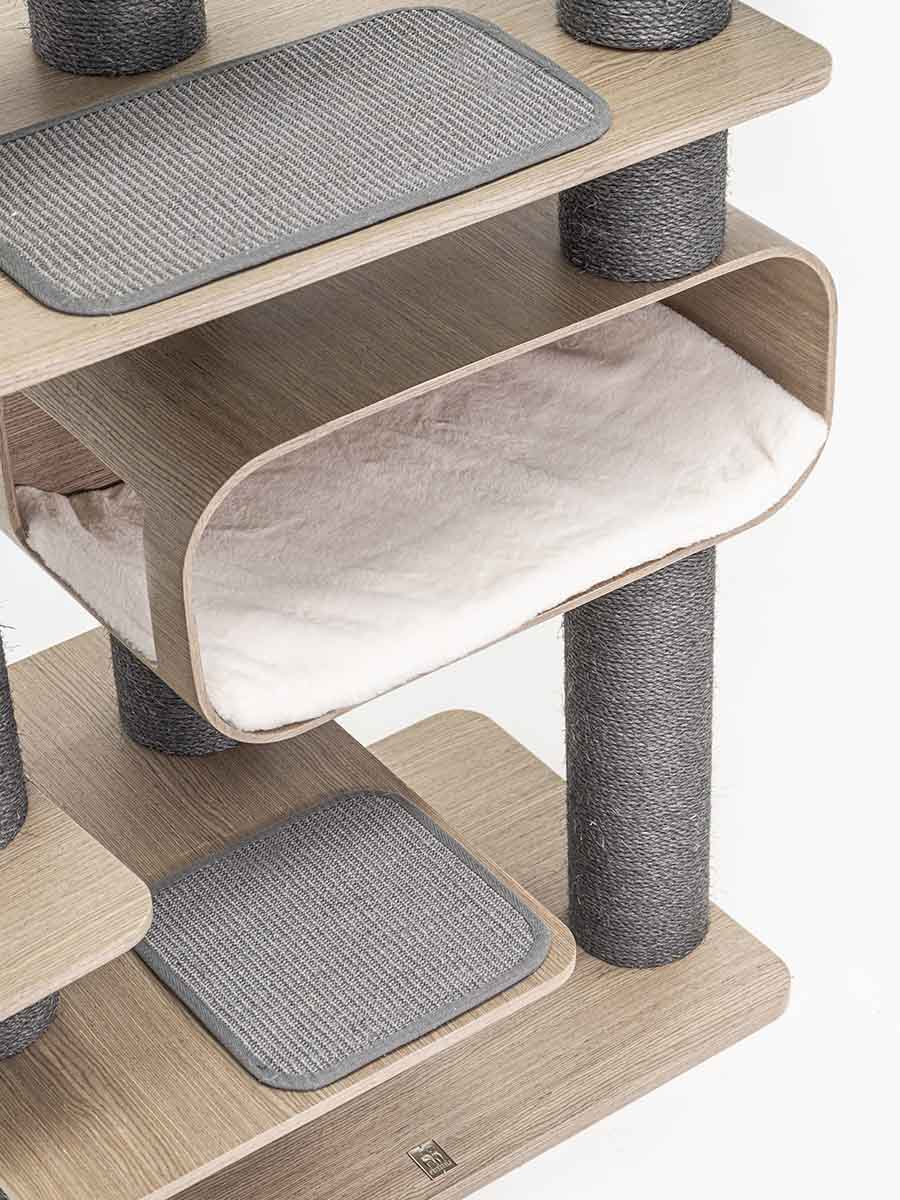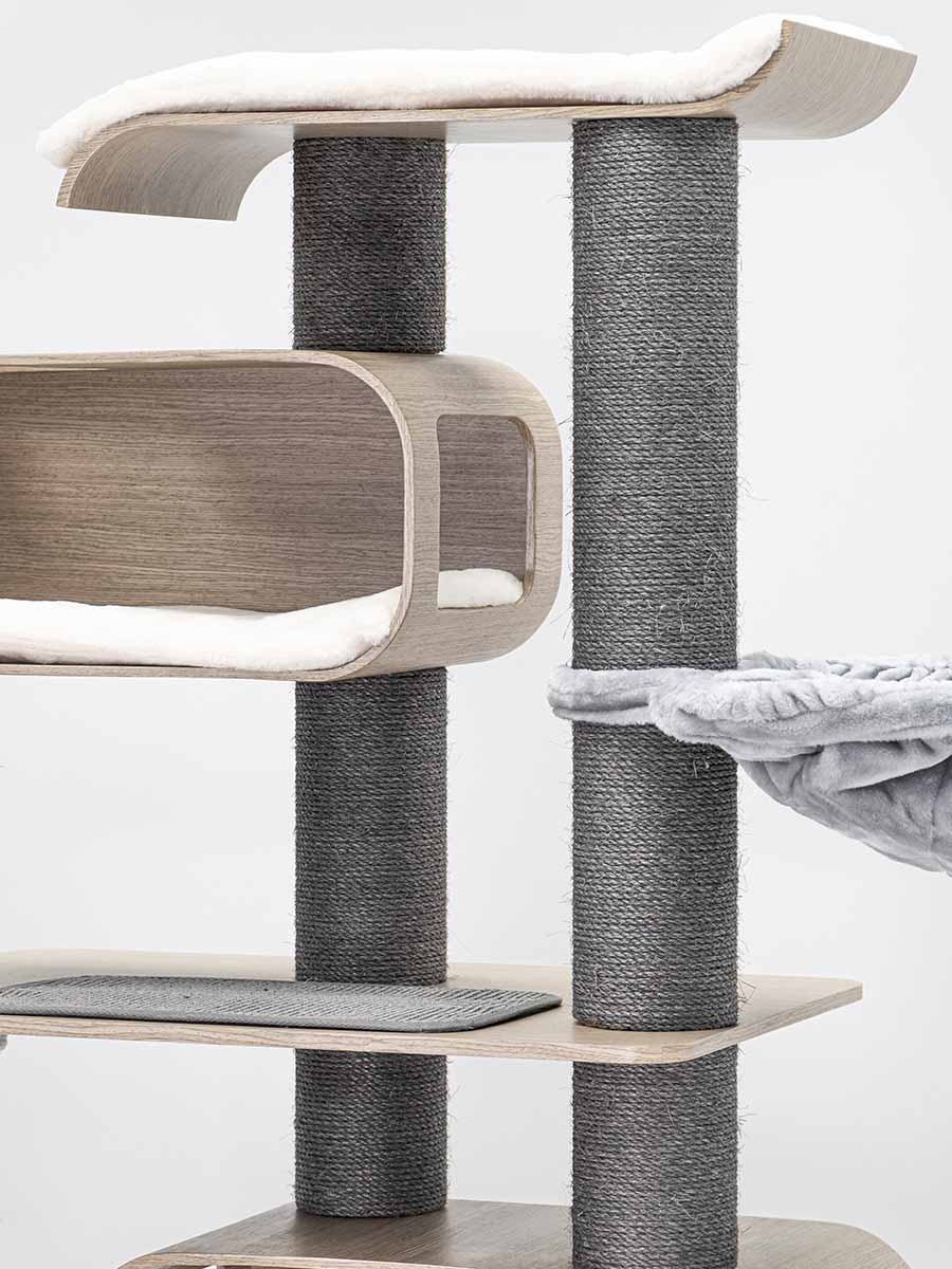 The Virgo 196 is truly a super-modern scratching post that looks great in your living room. This scratching post is tall and a real eye-catcher in your home – it is beautiful, luxuriously finished and, thanks to the matching colours, it fits in with any interior. But importantly of course, this scratching post is a treat for cats. Really everything your cat Nods is on it: an XXL lounge basket on top, two soft wash-out hammocks to relax in and a nice big cat house. All with soft plush and nice thick sisal to scratch on. This is the perfect scratching post for your cat! confidence is.