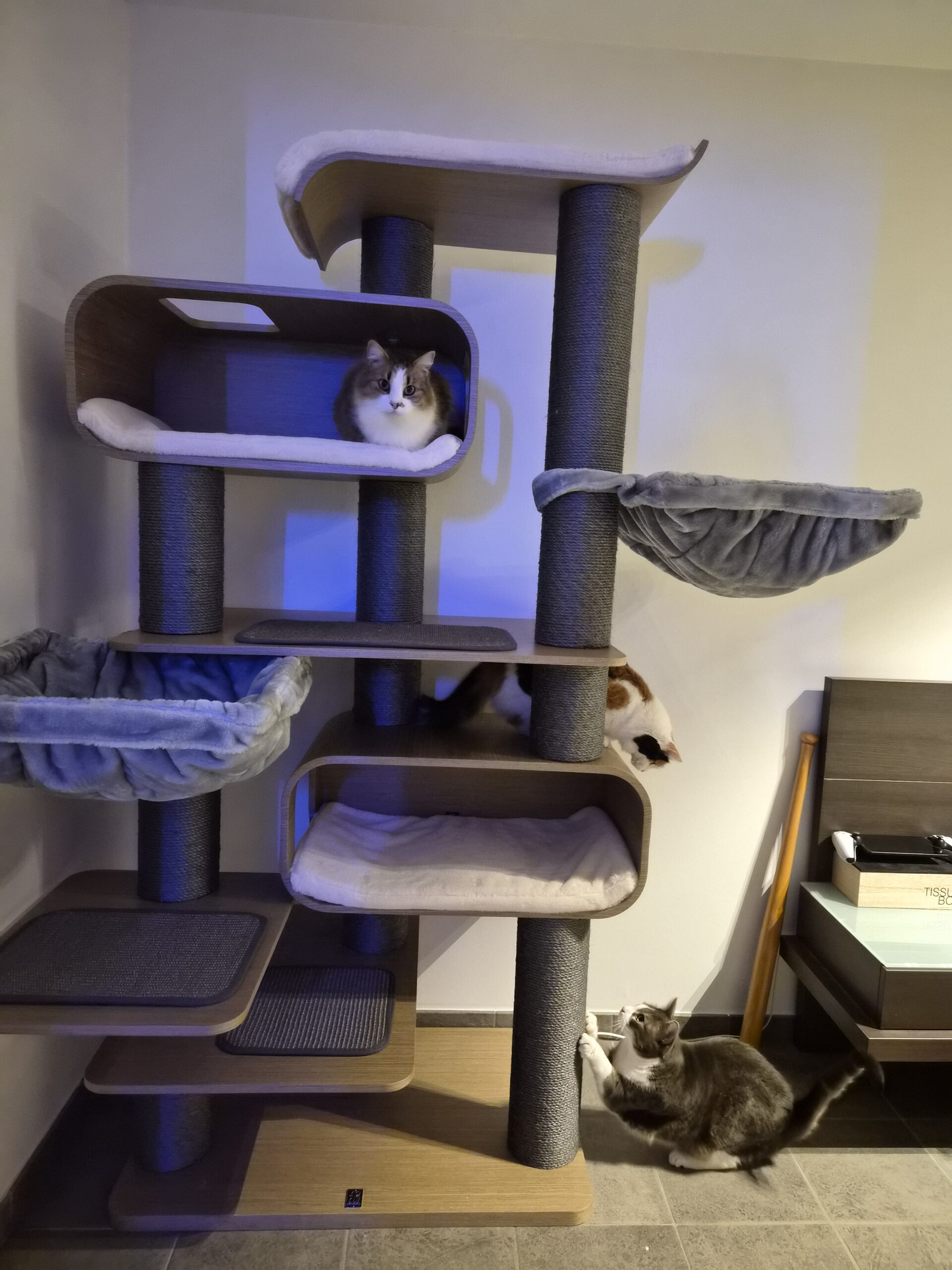Heel mooi,juist jammer dat je de krabpaal uit mekaar moet halen om de hangkussens eruit te halen.