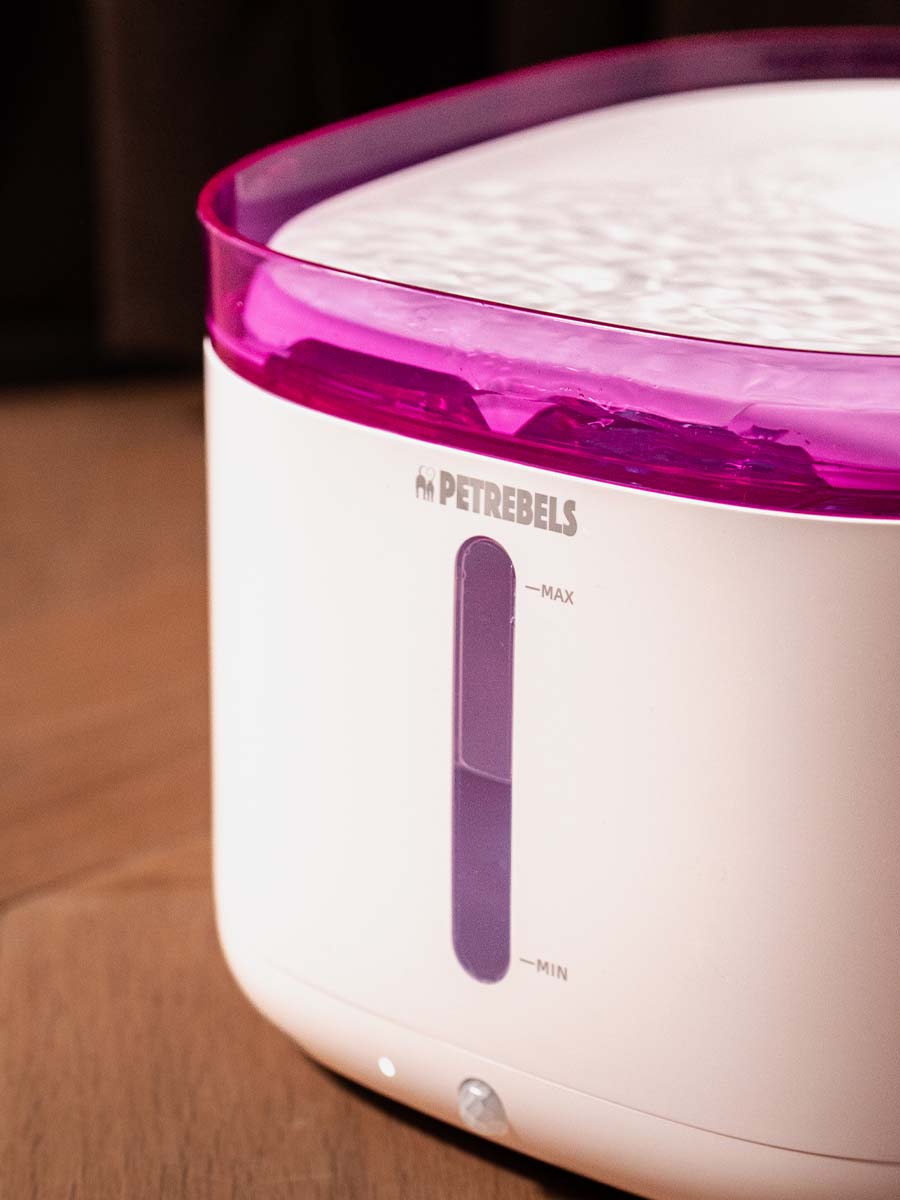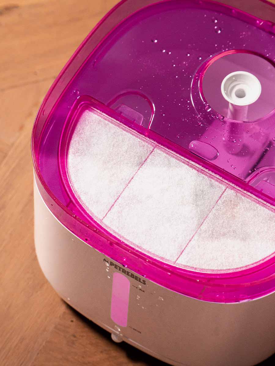 Heel erg fijne waterfontijn! Binnenkant bestaat uit één enkele bak zonder randen en de pomp is draadloos. Daarmee is alles goed schoon te houden. Accu gaat lang mee en je hoort erg helemaal niks van.