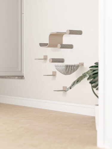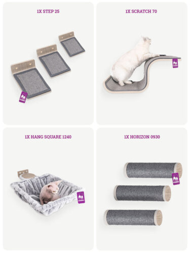 There is no shortage of sisal in this cat wall set. The strongly glued sisal rope of the Horizon 0930 climbing poles and the compact woven sisal carpet of the Steps 25 and Scratch 70 ensure maximum grip during your Rebels’ wild 5 minutes. But even the most energetic rebels need a moment of rest. After they have taken over the entire wall, they can chill out in the soft but sturdy Hang square-1240 hammock. This comfortable hammock with a steel frame has a removable cover to make washing easy.