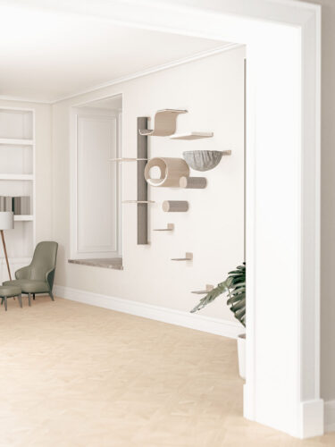 This versatile set can be assembled in multiple ways. Take into account the size and climbing ability of your cat(s). Do you have small cats or do they have trouble climbing? Then hang the parts close together. Do you have large, energetic cats? Then you might consider hanging the parts further apart.