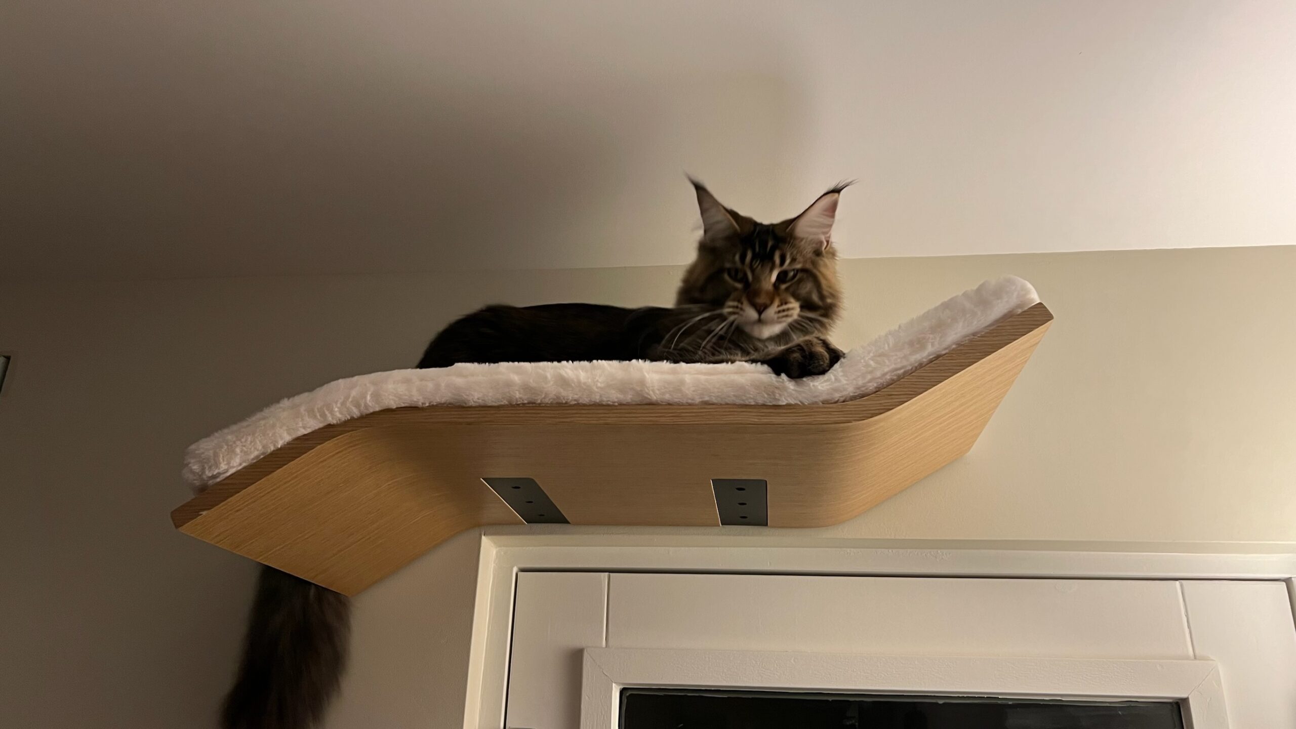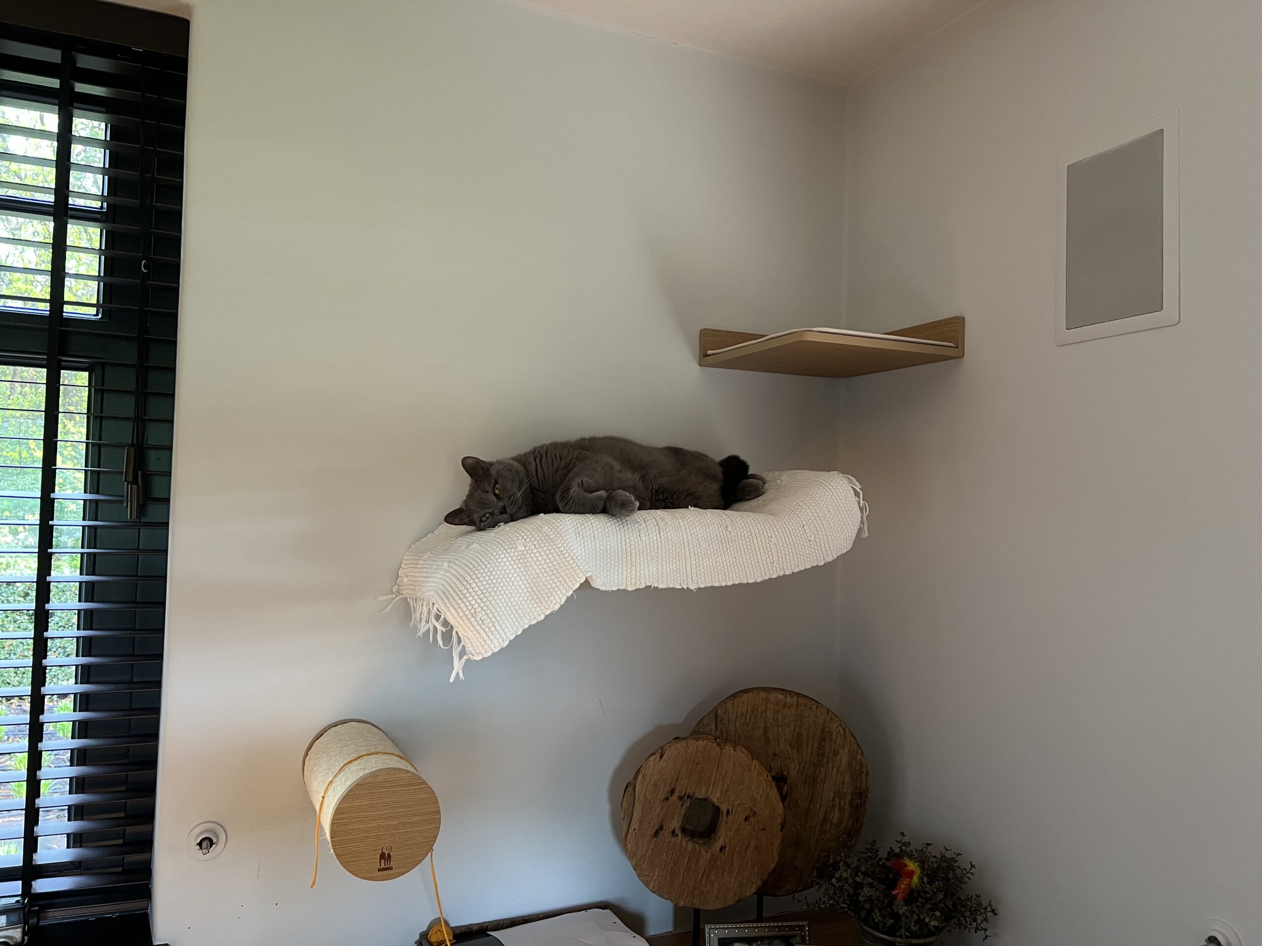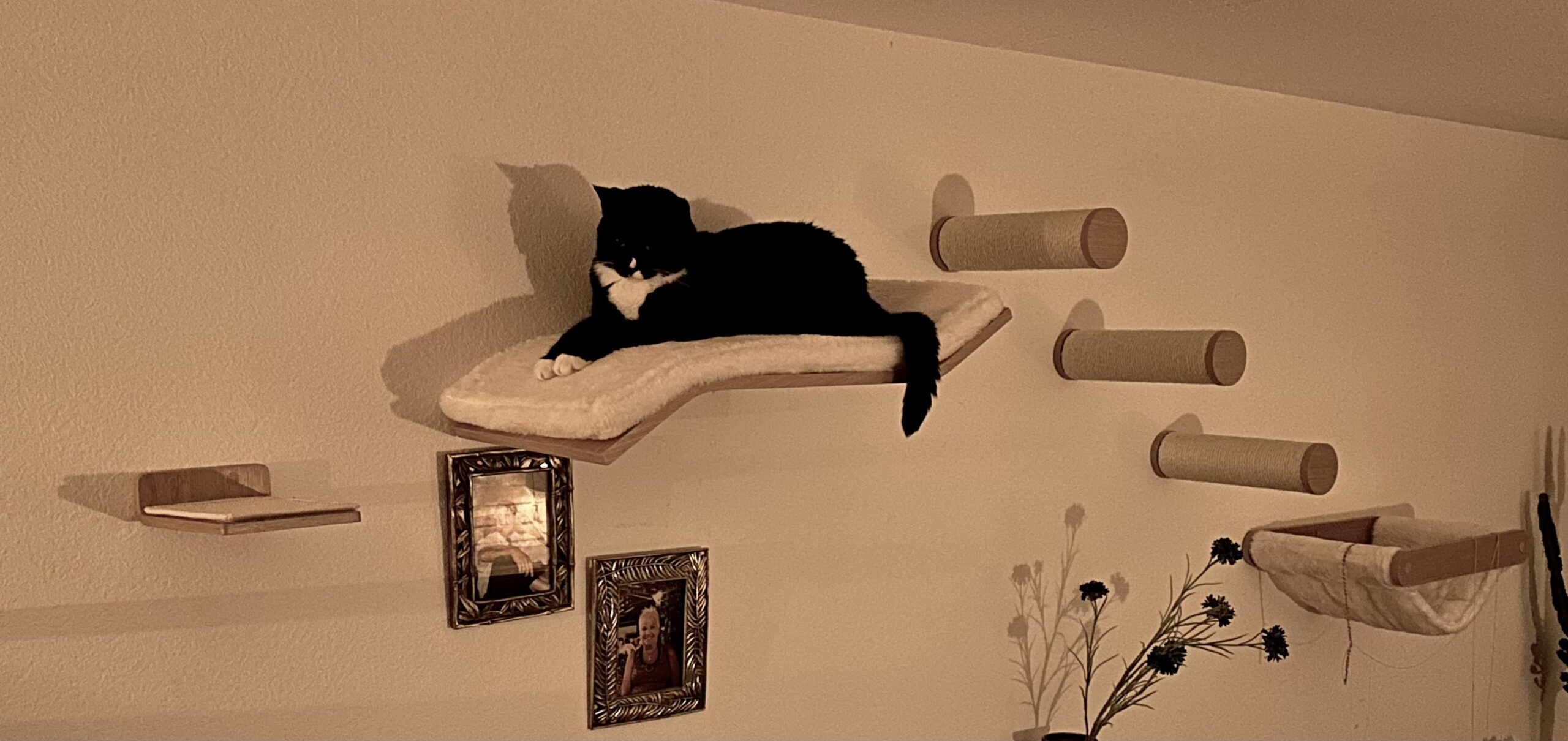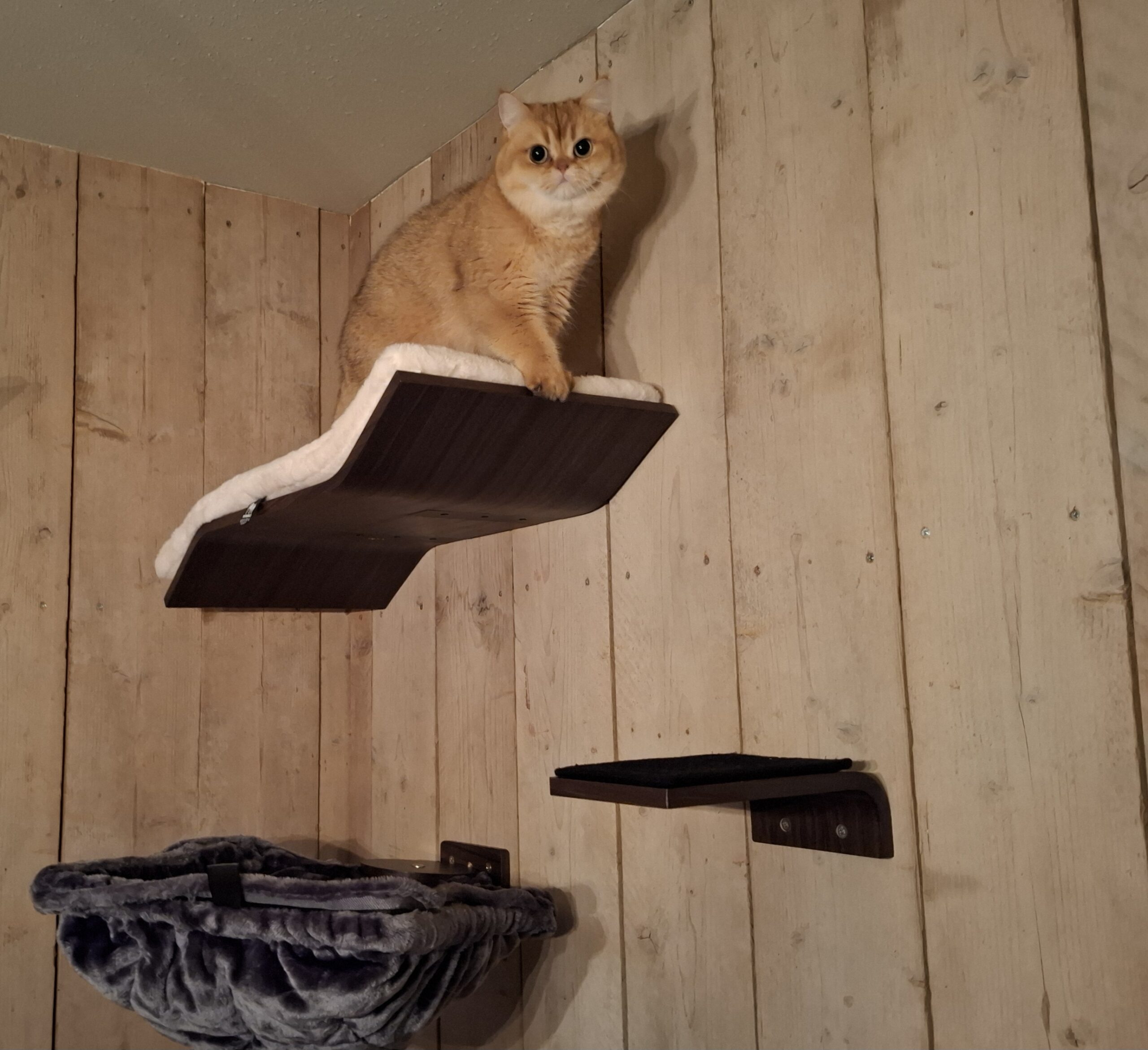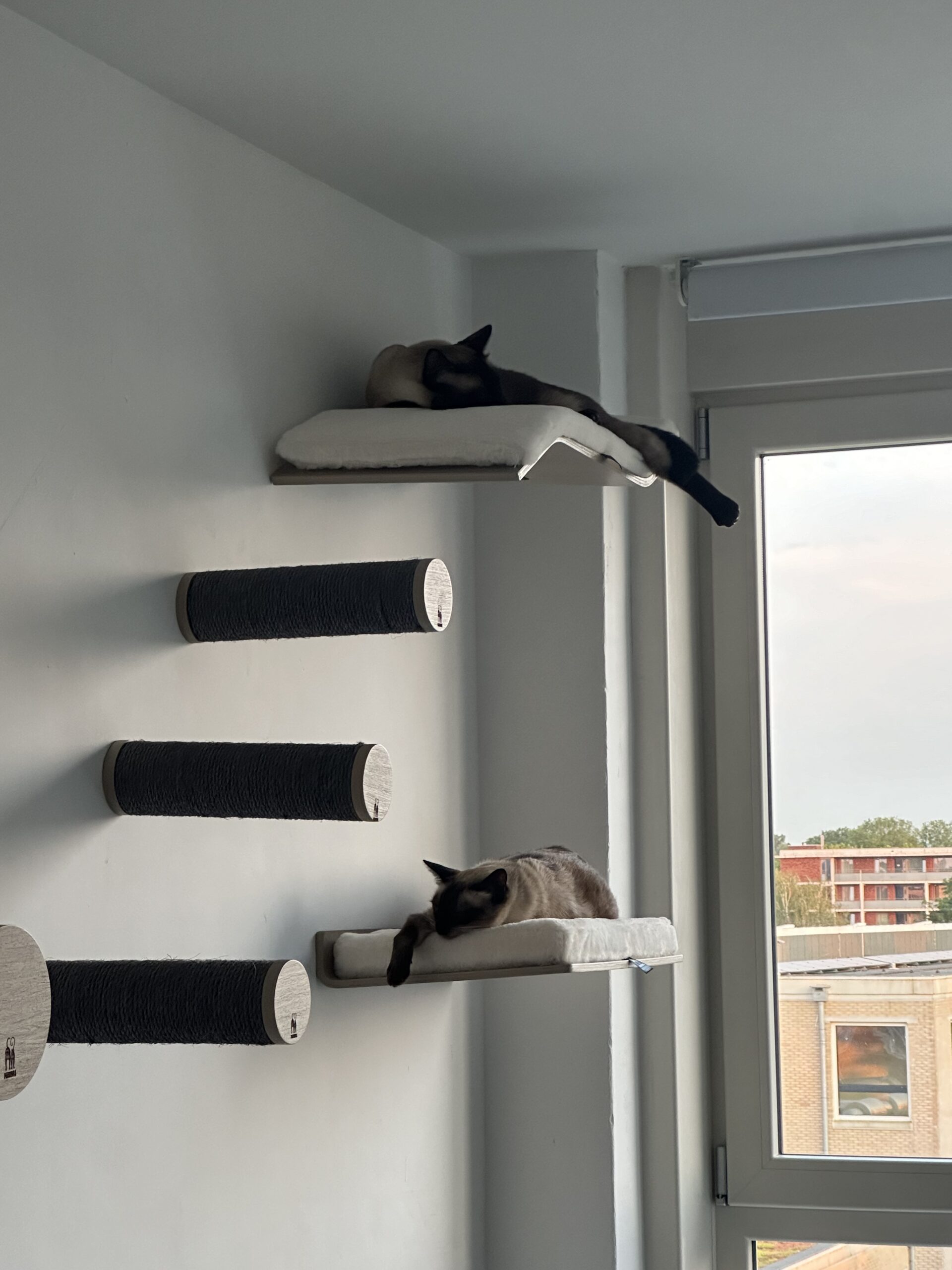 Wave 70 is a tastefully curved wall shelf with cat cushion and part of our Wall of Rebels: a beautiful collection of products for cats to sleep, play, climb, run over and scratch at. Hang Wave 70 low to the ground if your cat is still small or a bit older. Or high up if your cat is playful and active. Do you have more cats in the house? Of course you can spoil them with a nice place to sleep too – Moon 40 is cosy and cosy and Relax 50 and Curve 70 are big and soft. And with the cool Wall of Rebels Steps, Scratch 70, Ladder or Bridge every part is easily accessible.