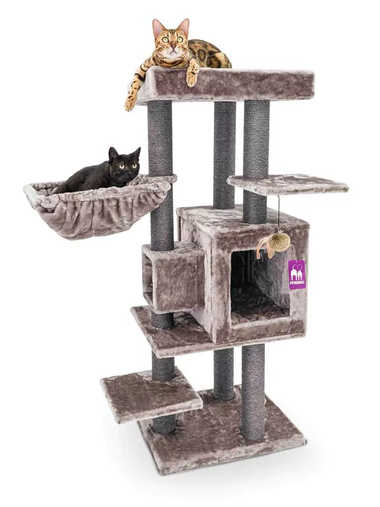 A designer cat tree (or designer scratching furniture) is a cat tree for cats that not only does its job but also looks great. Designer scratching posts are made from high-quality materials – such as luxurious plush, extra-thick sisal, and durable wood.