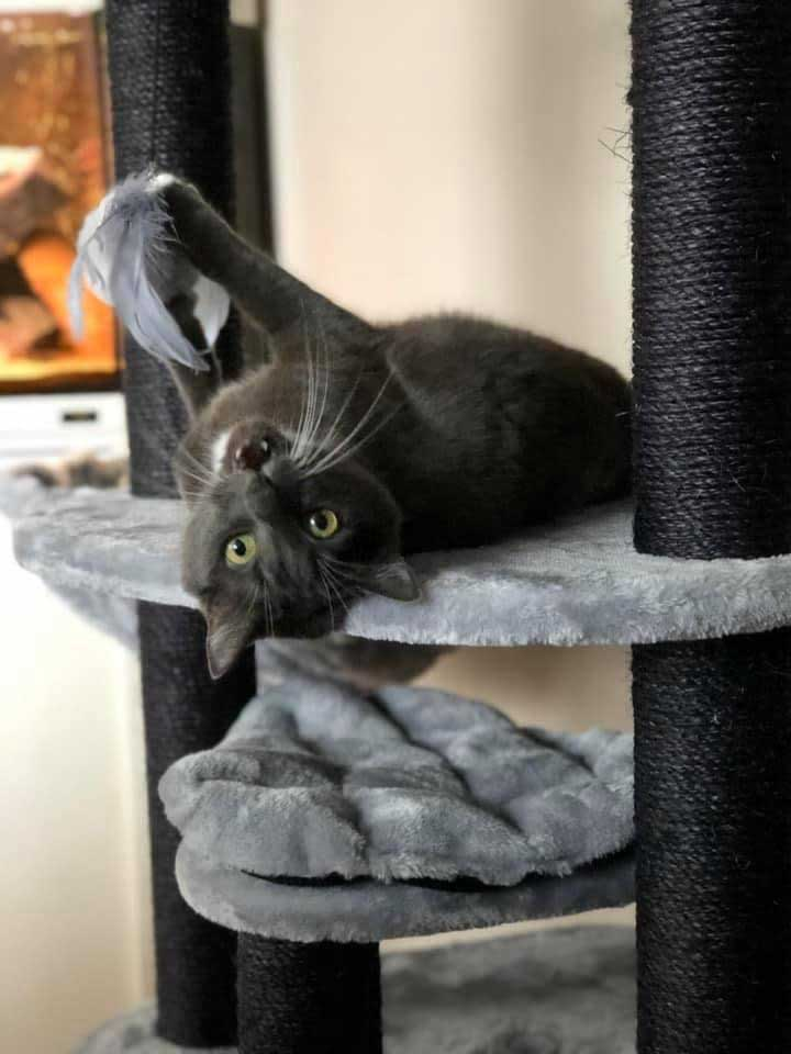 Gabry n’a pas beaucoup d’espace à la maison, mais elle voulait quand même une griffoir robuste. Et une où ses deux chats puissent avoir suffisamment de place pour dormir. C’est pourquoi elle a choisi la Catharina 160 gris. Elle est haute, a de délicieux hamacs et ne prend pas beaucoup de place. Et après 1,5 an, elle a l’air toujours neuve.