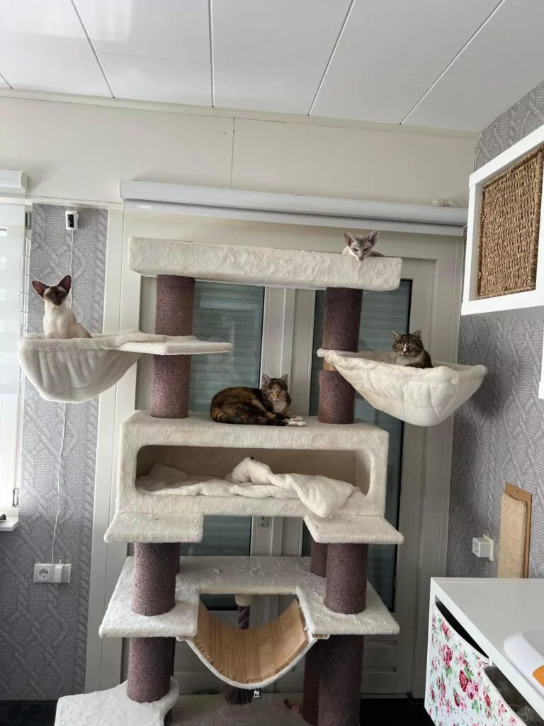 Dans cette pièce dédiée aux chats, les chats dorment chaque nuit lorsque nous allons au lit. Le matin, j’ouvre immédiatement la porte dès que nous nous réveillons. Et c’est agréable, car ils sont tellement heureux de me revoir moi et ma famille. Je suis mère au foyer et donc souvent à la maison. Les chats trouvent ça aussi très agréable, car ils sont toujours près de moi. Et ils me font rire chaque jour – quand ils jouent maladroitement avec leurs jouets ou quand ils miaulent très fort en regardant les oiseaux dans le jardin.