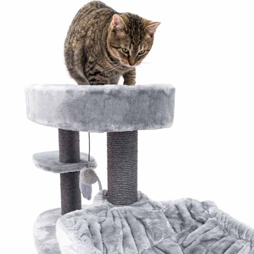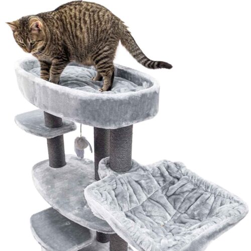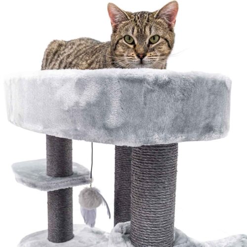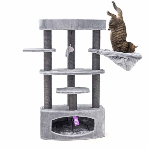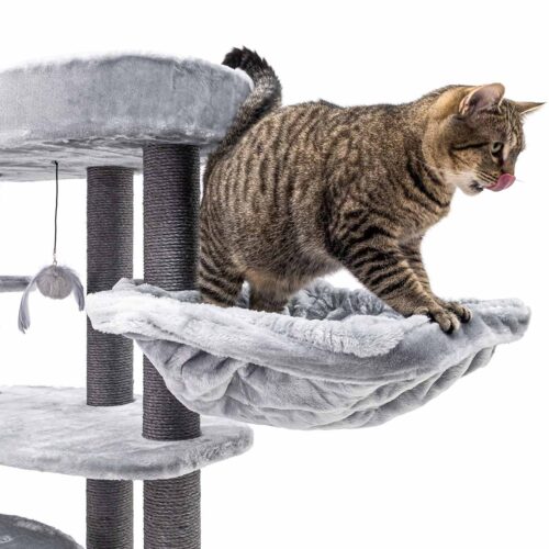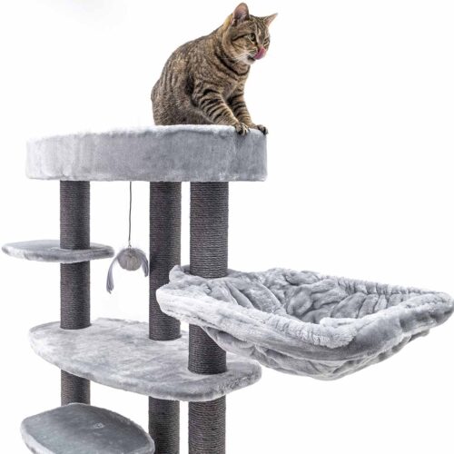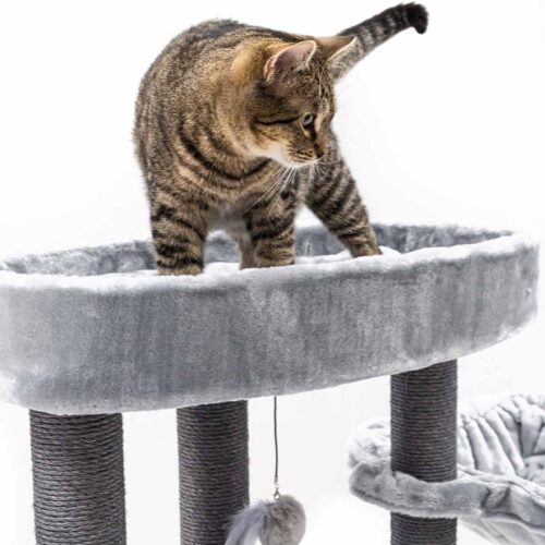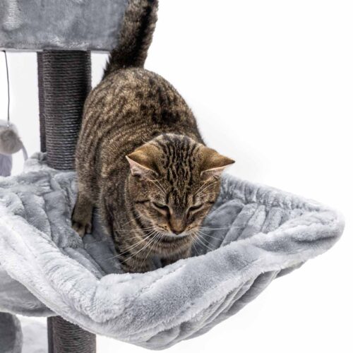 Ton chat mérite un truc sympa, un truc qui le rendra vraiment heureux ? Alors, fais-lui plaisir avec un nouveau griffoir. Notre Alexandra 127, par exemple. Ce griffoir est recouvert de la plus douce des peluches et offre pas moins de trois endroits confortables pour dormir en toute sécurité : un hamac relaxant, un panier lounge et une niche douillette avec un coussin moelleux à l’intérieur. Avec ses hauts troncs en sisal solide et ses larges plateaux, c’est aussi un endroit où ton chat peut grimper et faire ses griffes. Un arbre à chat de rêve !