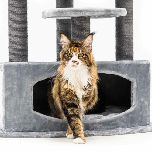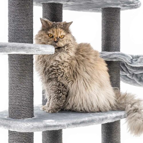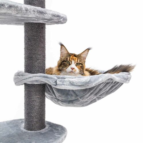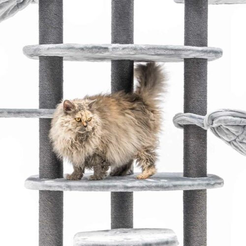 Notre griffoir Alexandra 177 est fait pour les chats qui aiment grimper, griffer et sauter. Ce super griffoir leur permet de faire tout ça : les hauts troncs en sisal sont parfaits pour griffer et les plateformes sont faites pour grimper et sauter. Ce meuble à griffer haut est doux et a une base épaisse. Tout en haut, il y a un panier confortable pour les chats qui veulent tout surveiller, et la niche en bas est parfaite pour les chats qui aiment se retirer un moment.