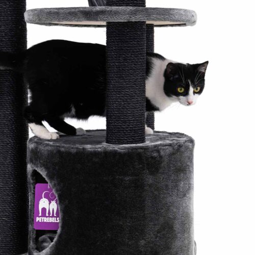 Cet arbre à chat compact a vraiment tout ce dont un vrai Rebel a besoin, sans prendre trop de place. Dormir, jouer, gratter et rôder, avec le Charlotte 134 vos Rebelles seront comme chez eux. Avec des poteaux à griffer de 9 cm de diamètre, une couchette moelleuse, un joli hamac et un sofa de repos extra-large au sommet, le Charlotte 134 répond à tous les besoins. Et grâce à la plaque de base épaisse il est super stable comme un vrai arbre.