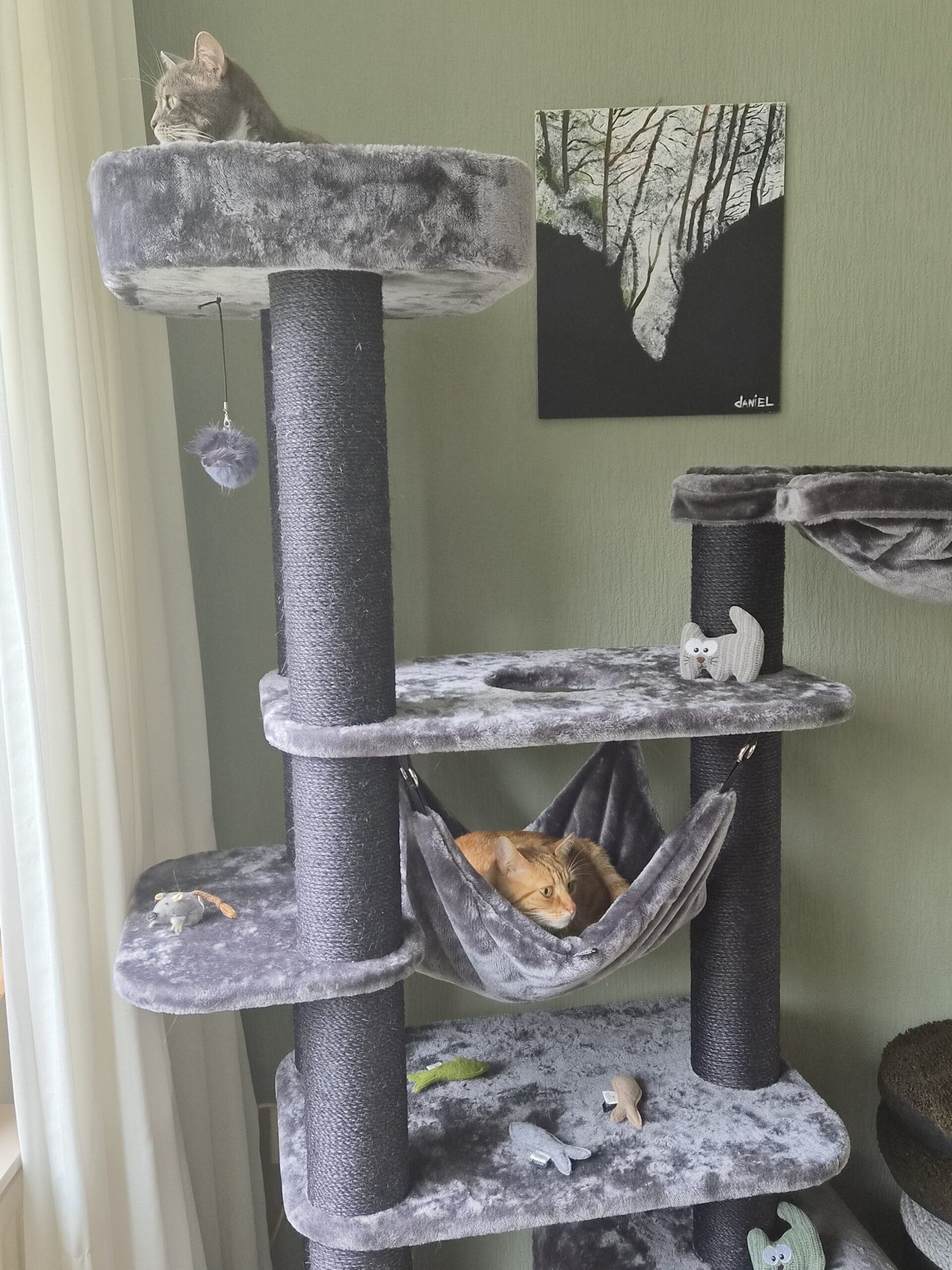 Notre griffoir Interstate 178 est vraiment magnifique. Avec sa taille impressionnante et sa construction solide, il est parfait pour les chats qui passent beaucoup de temps à l’intérieur et qui adorent griffer, jouer, grimper et se détendre. Les grands poteaux à griffer et les plateformes incitent ton chat à être actif, tandis que le panier confortable, la grande niche et les hamacs moelleux sont parfaits pour faire une bonne sieste. Avec le Funky Rebel, c’est l’endroit préféré de tous les chats pour se détendre et jouer !