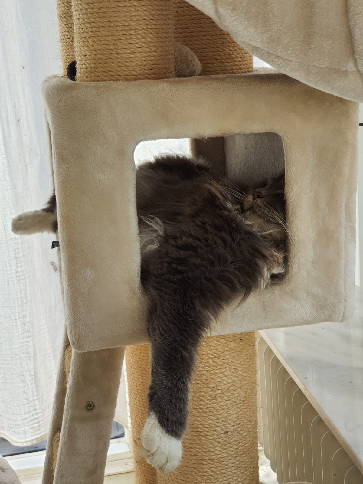 Mein MaineCoon-Mix Kater zappelt sehr viel im Schlaf. Ein normaler Kratzbaum war okay aber er hat sich ein paar mal im Schlaf von ganz oben runter geschmissen, also musste ein größerer Kratzbaum her! Der Parklane war dafür perfekt! Nicht zu groß, stabil und der Schlafplatz oben hat eine Kante, das mein Kater da genug Platz hat und sich nicht runter zappeln kann. Und der Stoff ist auch super weich. Nur müssen meine Katzen jetzt noch lernen der Hängematte zu trauen, haha~!