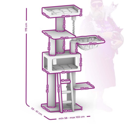 Vous voulez impressionner votre chat ? Alors offrez-lui ce modèle plus que complet, haut et robuste de notre collection Lucky Bastards. Car votre chat est un bâtard chanceux s’il peut faire la fête dans sur le Parklane 175. Griffer, grimper, jouer et étudier les visiteurs. Tout est possible ! Dormir aussi, bien sûr – dans la niche luxueux, dans le hamac extra-large ou tout en haut, dans le sofa extra-large avec un oreiller doux comme du velours.