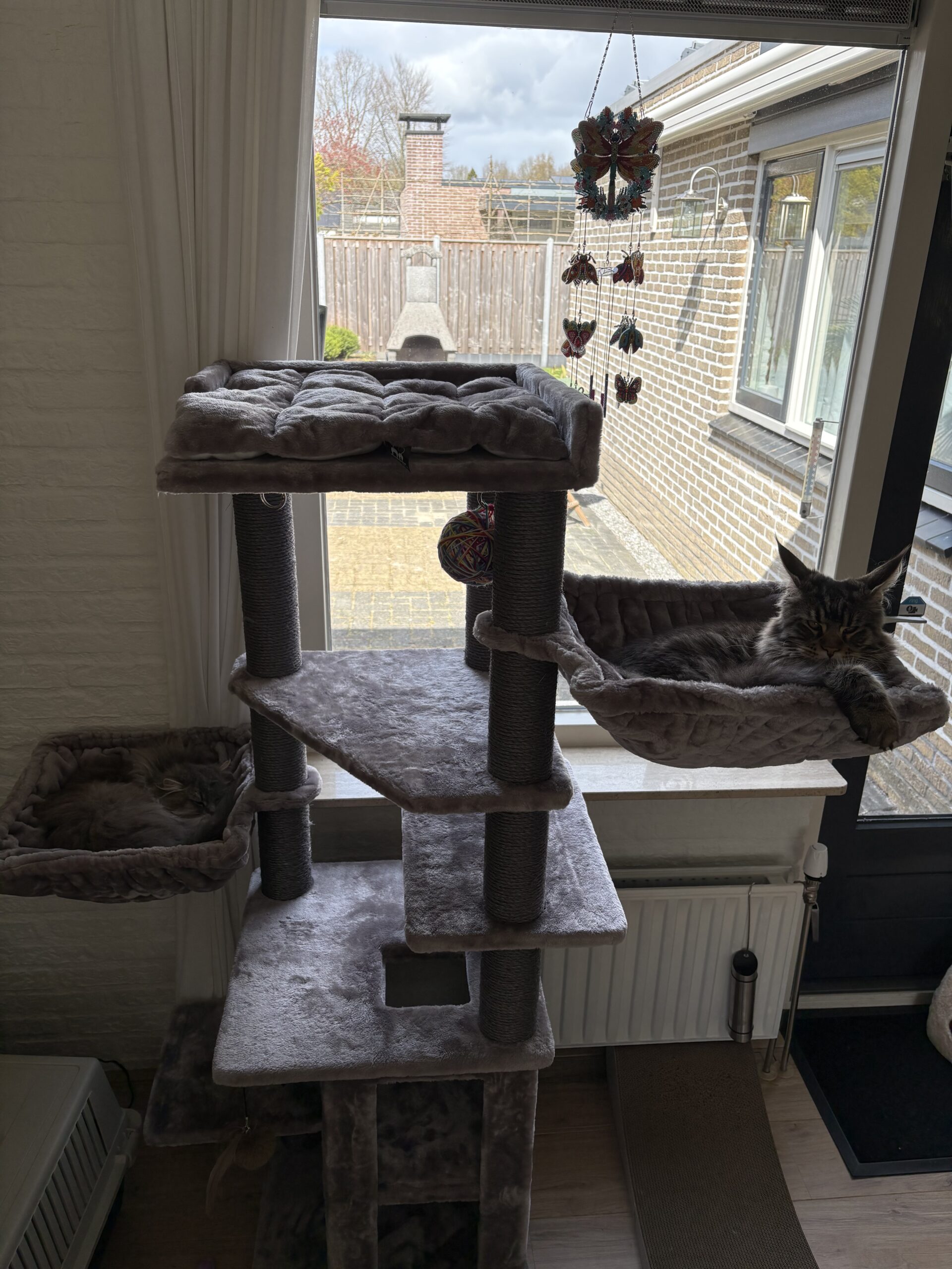 Mooie, stevige krabpaal, de mandjes zijn duidelijk favoriet, de hangmand is weer verwijderd: met vier Maine Coons die daar toch niet in gingen liggen overbodig. Alleen Jewel ligt soms in de onderste box, de anderen zijn daar te groot voor