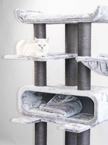 Der Kratzbaum ist wunderschön, Plüsch super weich. Am 5.11.bestellt,am 7.11.kam er an.Der unterste Teil bis zur Höhle in der Mitte ließ sich etwas schwierig aufbauen da ich alleine aufgebaut hab ,hab deshalb 3,5 Stunden gebraucht als Frau. Aber nicht schlimm, hat trotzdem Spaß gemacht. Der Baum hat noch ein bisschen ein Eigengeruch nach neu,meine Katze braucht noch ein wenig um ihn richtig anzunehmen. Gekratzt wird an dem langen Stamm unten links. Ab und zu liegt sie in der Höhle, mit ganz oben scheint noch nicht so ihrs zu sein,dann eher auf der Höhle oder auf dem Liegebrett drüber. Ihr Lieblingsplatz am Baum ist die schöne weiche Liegemulde, meine kleine Mini Maine Coone verschwindet darin als Fliegengewicht mit 3,8 kg und mit einem Alter von 20 Monaten.