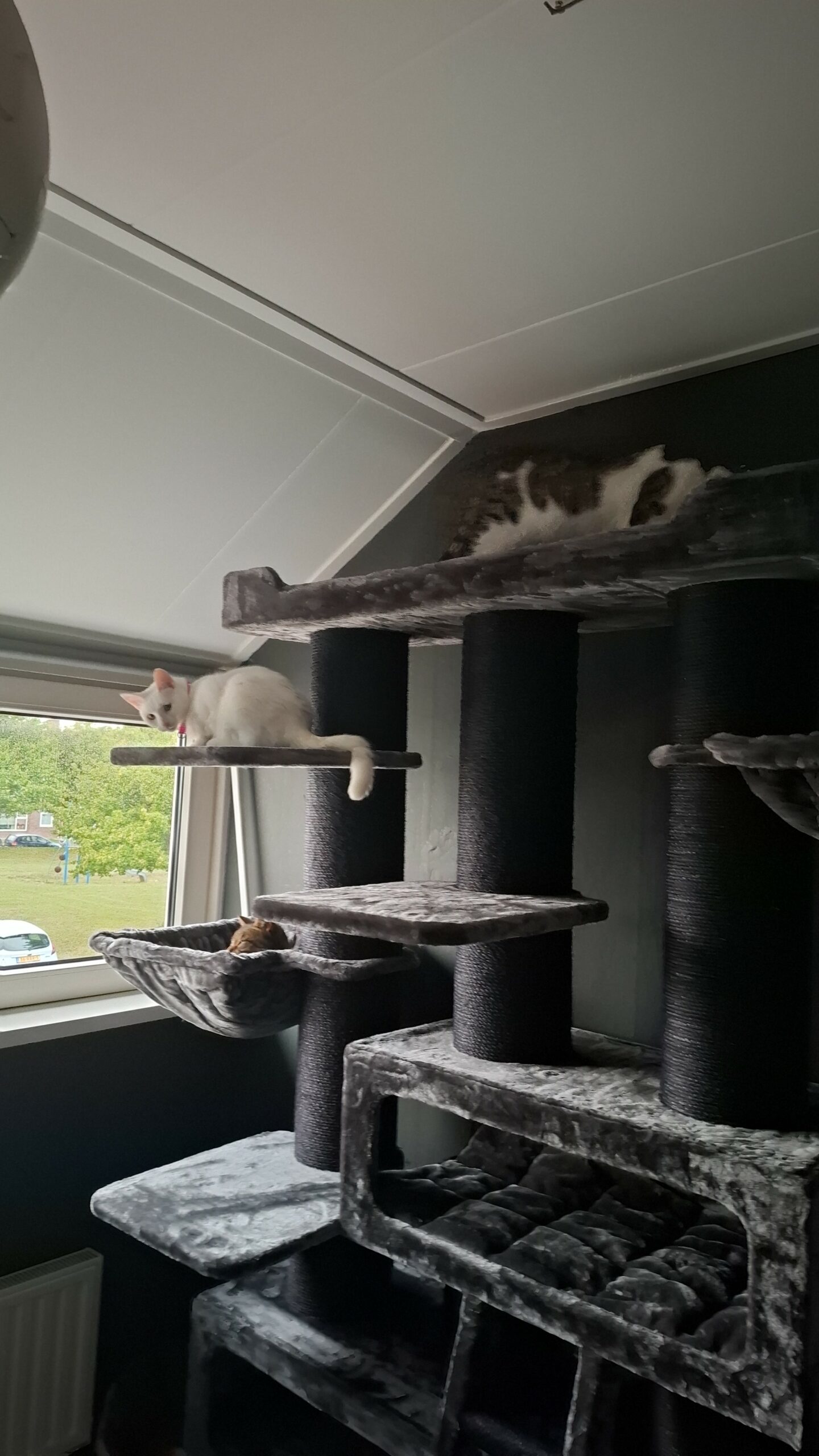 De krabpaal staat er prachtig bij, en voelt ook aan als een kwalitatief goed product. De katten zaten er na een minuutje of 45 al speurend rond te lopen op de paal zelf. Na enige tijd liggen er 2 braaf in hun ‘eigen’ mandje. De derde zit er nog een beetje tegen aan te kijken met het idee ‘ik lig liever op een kleedje op de grond’. Maar gezien de historie van de 3 zullen ze er alle drie in liggen.