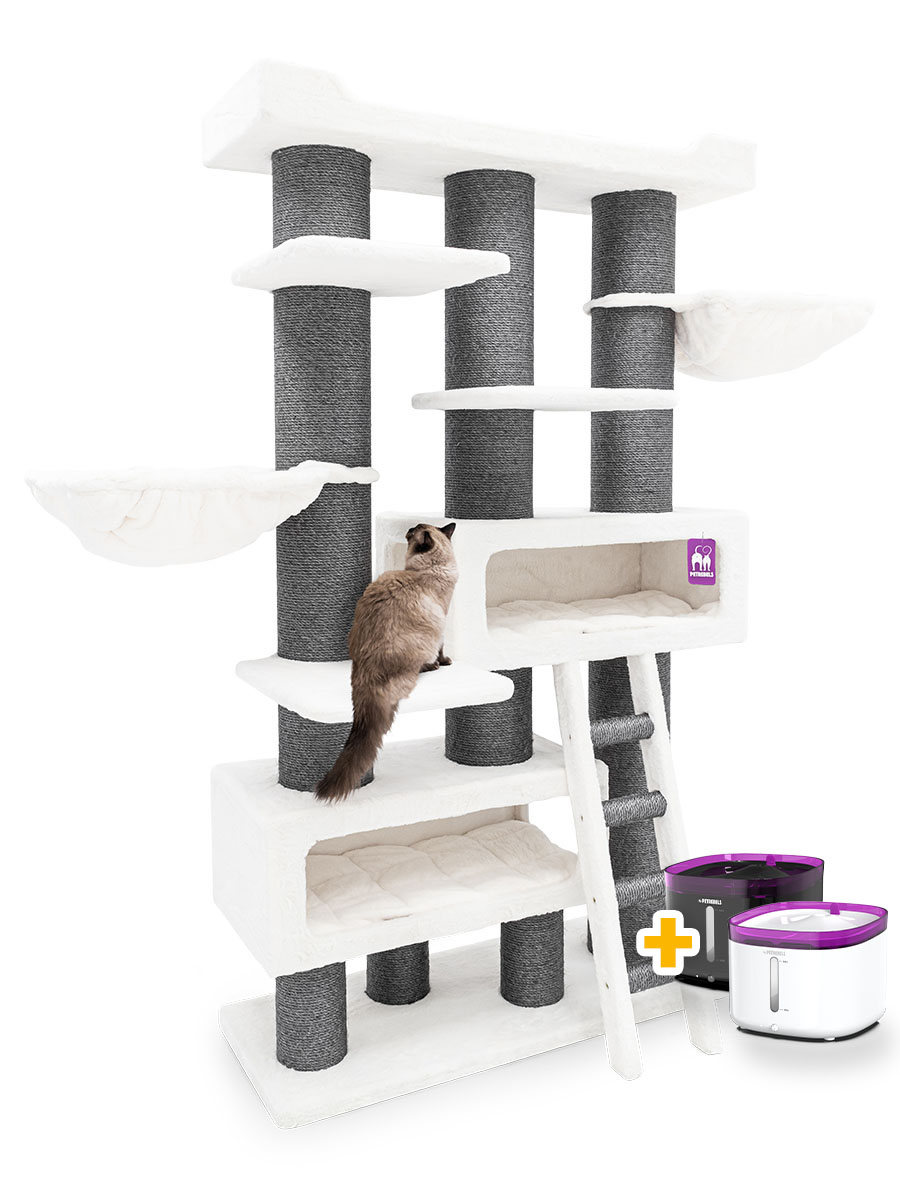 Robuste, haut et très stable. Cet arbre d’achat de qualité supérieure se dresse comme un monument. Ou mieux : comme un gratte-ciel de 2 mètres de haut ! Car chaque chat, petit ou grand, doit pouvoir jouer, grimper et faire ses griffes en toute sécurité. Et dormir, bien sûr, car tous ces plaisirs fatiguent énormément. C’est pourquoi ce géant est équipé d’un immense sofa tout en haut, de deux hamacs solides et de deux niches spacieuses. Plus qu’assez d’espace pour se reposer de toutes les aventures passionnantes de la journée !